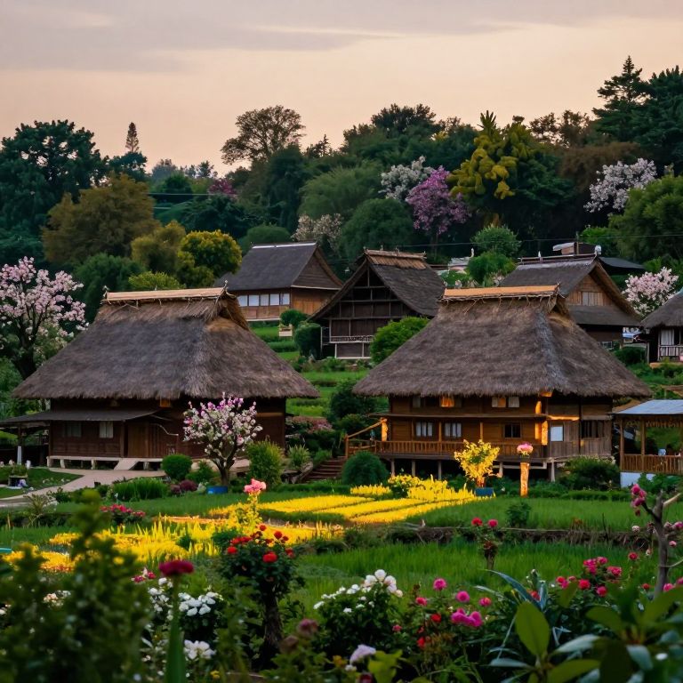 Janda, a serene village scene at dusk, traditional wooden houses with thatched roofs surrounded by lush greenery and blooming flowers, soft golden light casting long shadows, peaceful atmosphere, detailed nature elements, vibrant colors