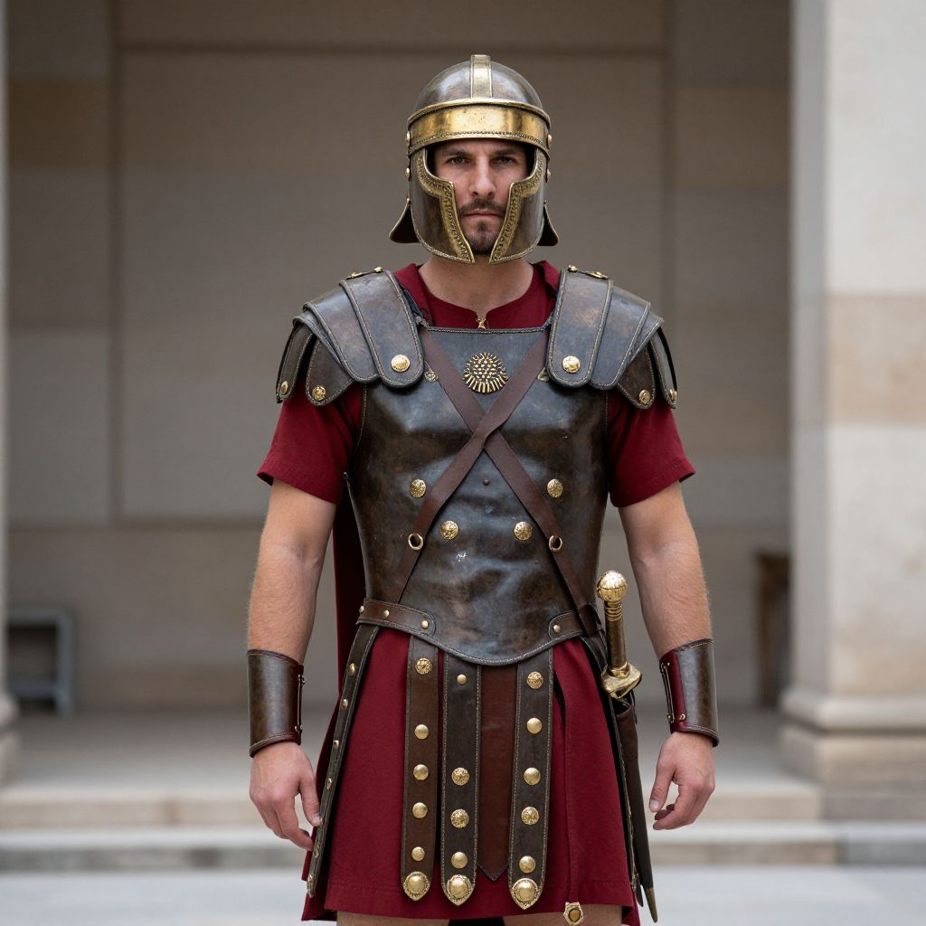 Adult roman soldier costume, man in a roman costume with a helmet and a sword