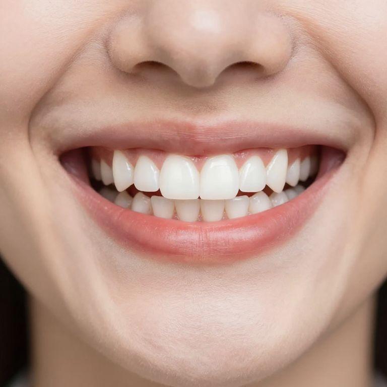 Denti close-up of a smiling person with perfect white teeth, natural lighting, soft focus background, detailed texture showing healthy gums and enamel, vibrant colors, high resolution, portrait style