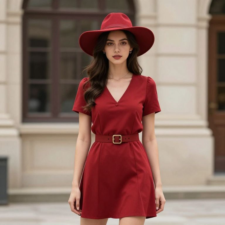 Photograph of a young woman standing outdoors against a blurred, beige stone building with dark-framed windows. She has long, wavy dark brown hair and wears a wide-brimmed, deep red hat. Her dress is short-sleeved, V-neck, and matching deep red, cinched at the waist with a belt that has a silver buckle. She has fair skin and red lipstick, looking directly at the camera with a neutral expression. The dress's fabric appears smooth and slightly glossy. The background is slightly out of focus, emphasizing her as the central subject. The overall style is chic and modern.