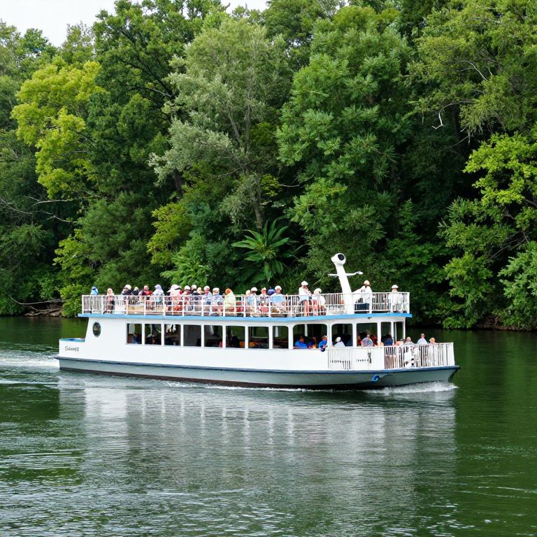 Tour boat \"Carrousel\" navigates through the serene, emerald waters of the Wisconsin River Dells, surrounded by lush green trees and filled with passengers enjoying a scenic journey.