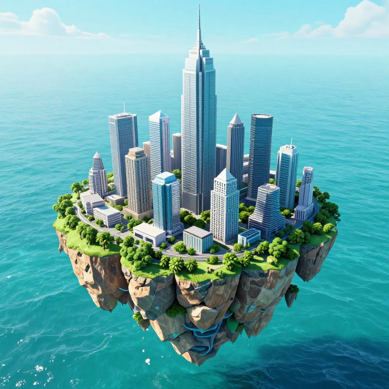 A surreal 3D-rendered metropolis floats serenely atop a vibrant turquoise ocean, its towering skyscrapers and lush greenery perched precariously on a floating island, evoking a dreamlike, cyberpunk-inspired vision where reality blends seamlessly with imagination.