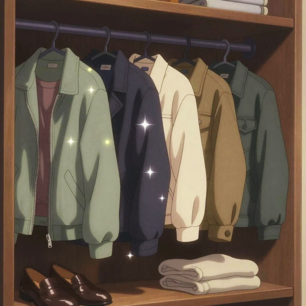 Anime closet featuring classic and modern outfits, animated sparkling effects, rich textures on fabrics, warm ambient light, cozy and imaginative, hand-painted anime aesthetic
