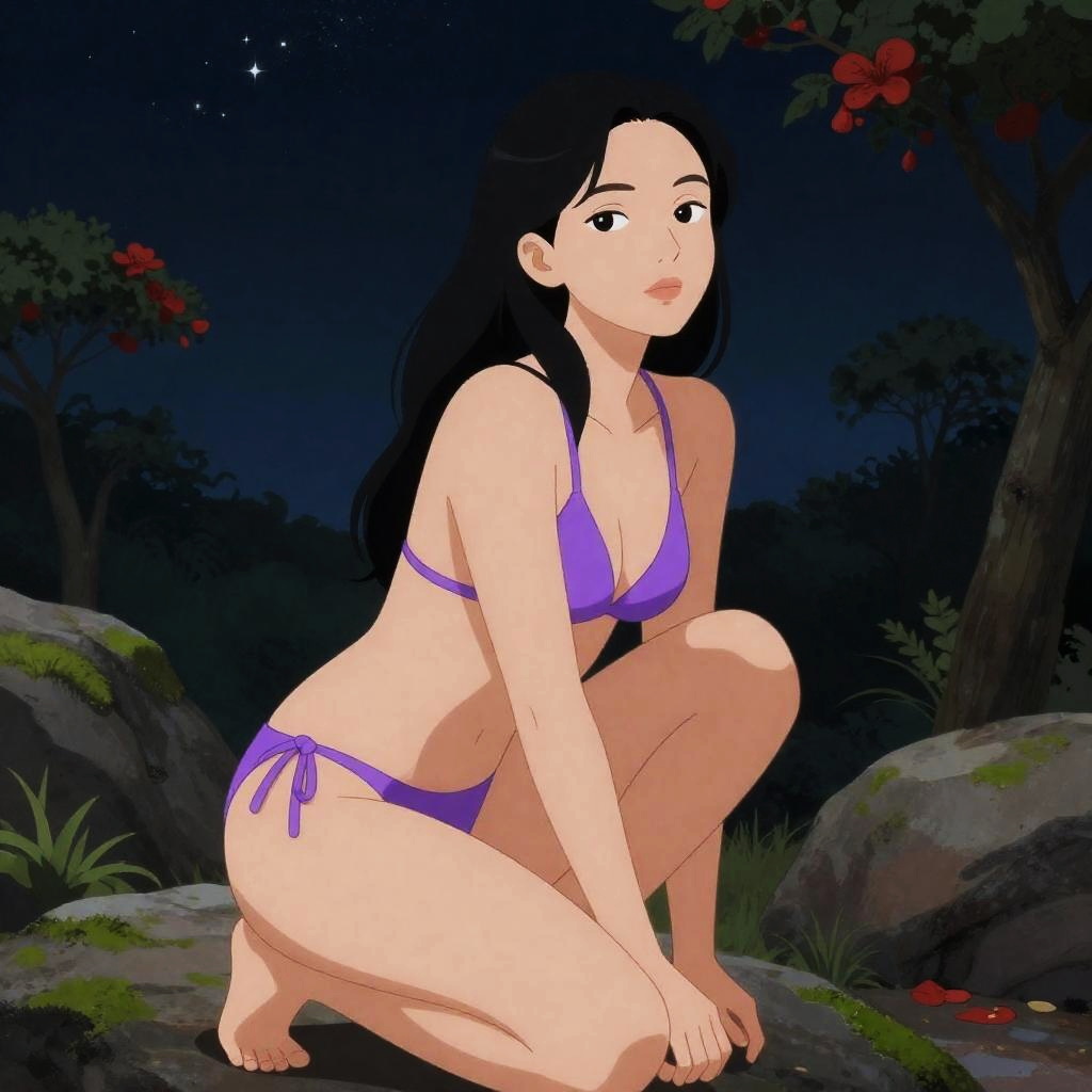 Digital illustration of a woman with long black hair, light skin, and a purple bikini, crouching on a moss-covered rock. Starry night sky, trees with red flowers on either side. She has a calm expression, looking slightly to the right.