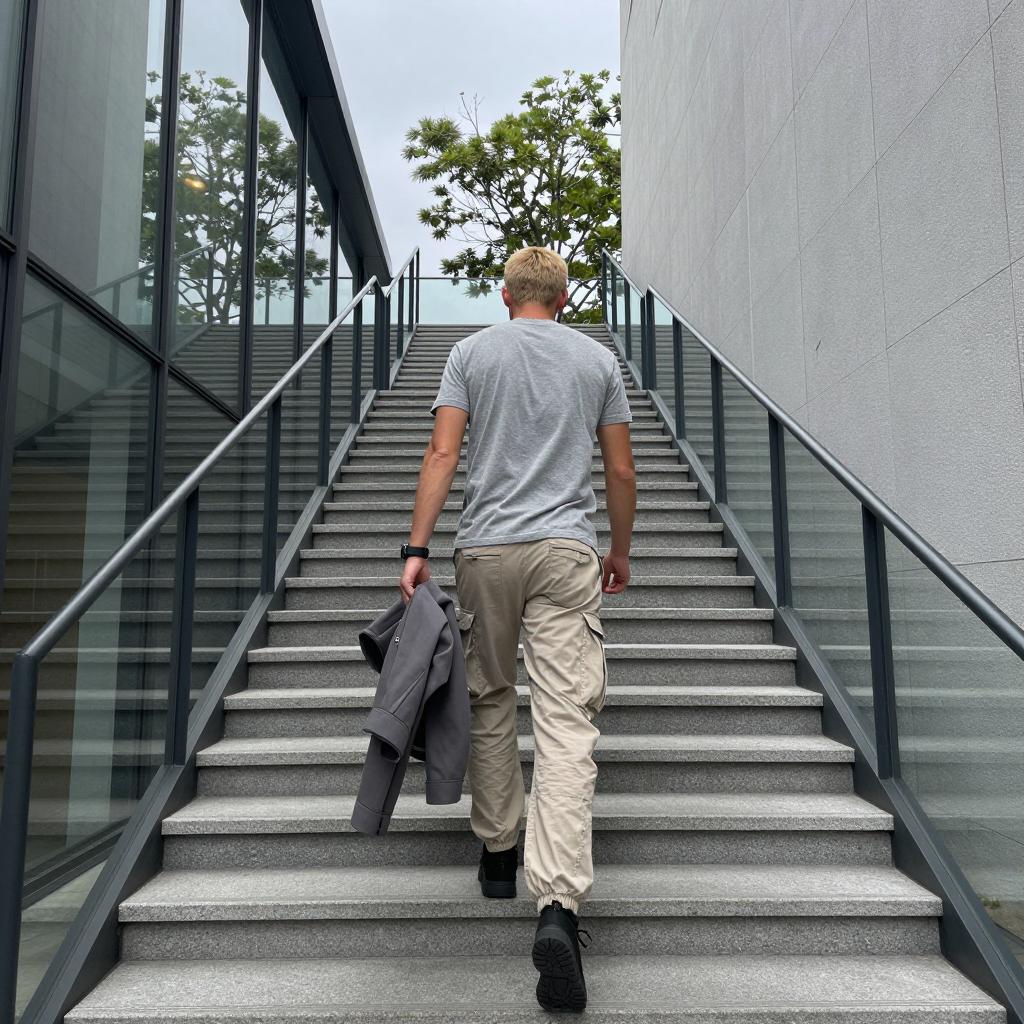 Man with short blond hair, wearing gray t-shirt and beige cargo pants, holding a gray jacket, walking up a modern glass-walled staircase. Overcast sky, misty background with trees and a building. Black metal railing, vertical glass panels, horizontal window at the bottom. Left side has more glass, right side has a tiled wall.