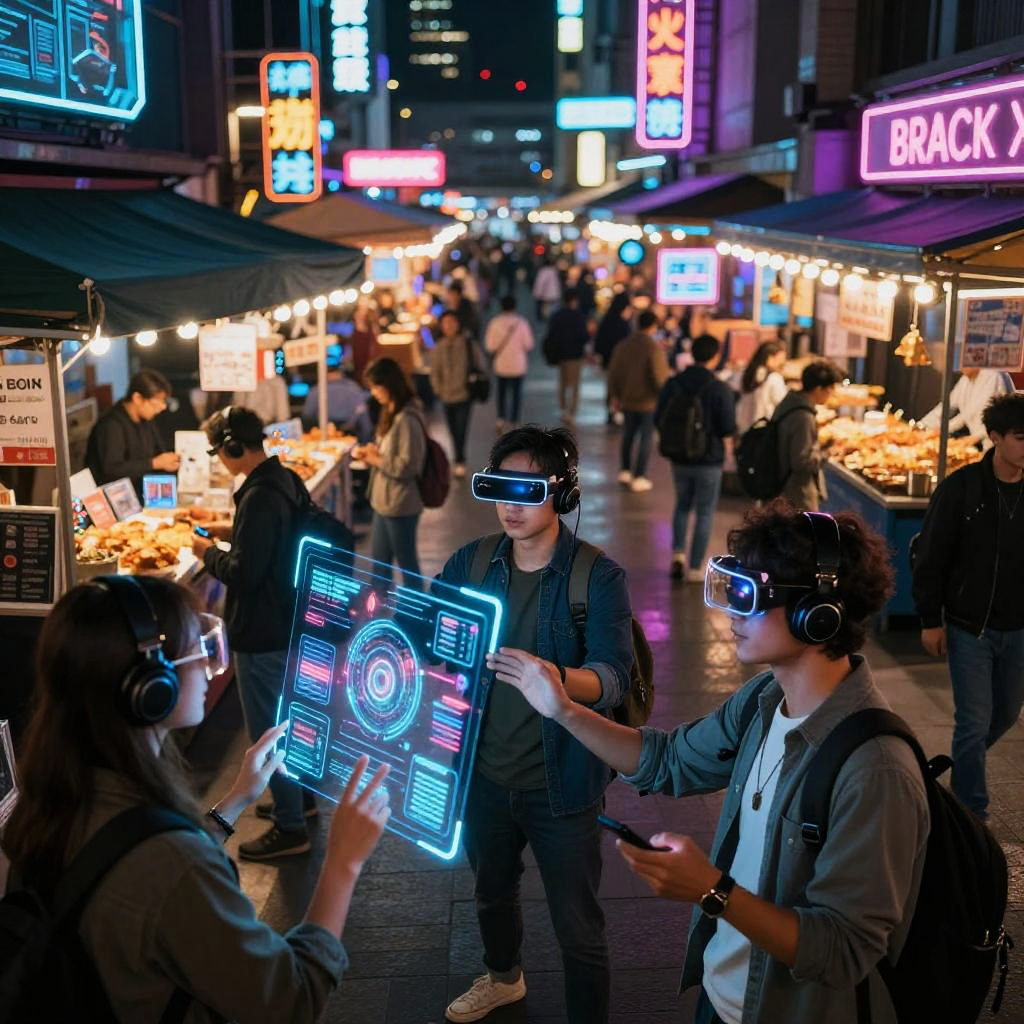 Conexion shown as a bustling digital marketplace with holographic interfaces and people interacting through augmented reality devices, a vibrant urban scene filled with dynamic movement and colorful neon lights, cyberpunk aesthetic, highly detailed and immersive.