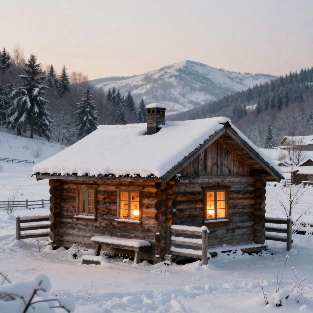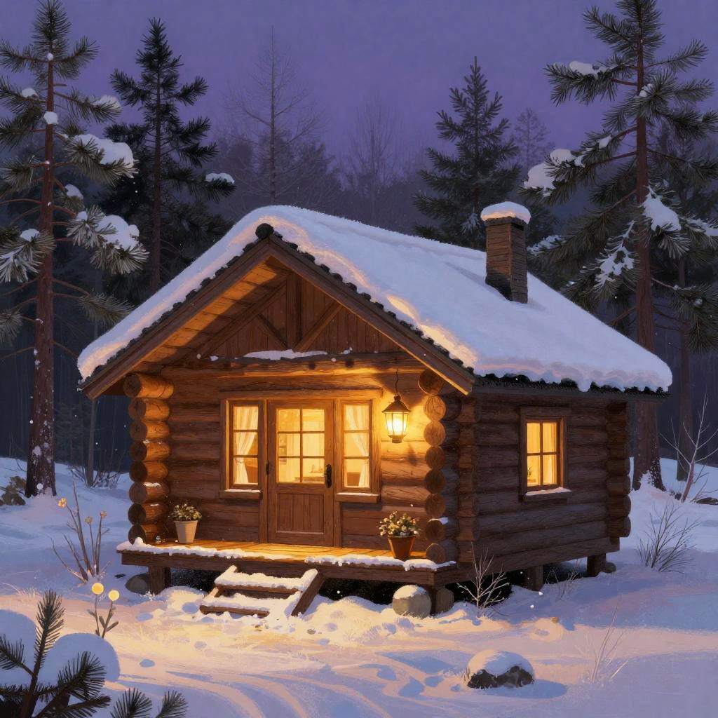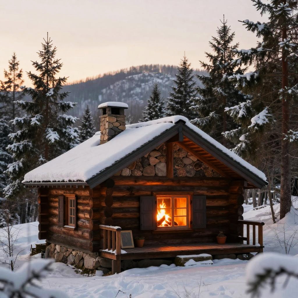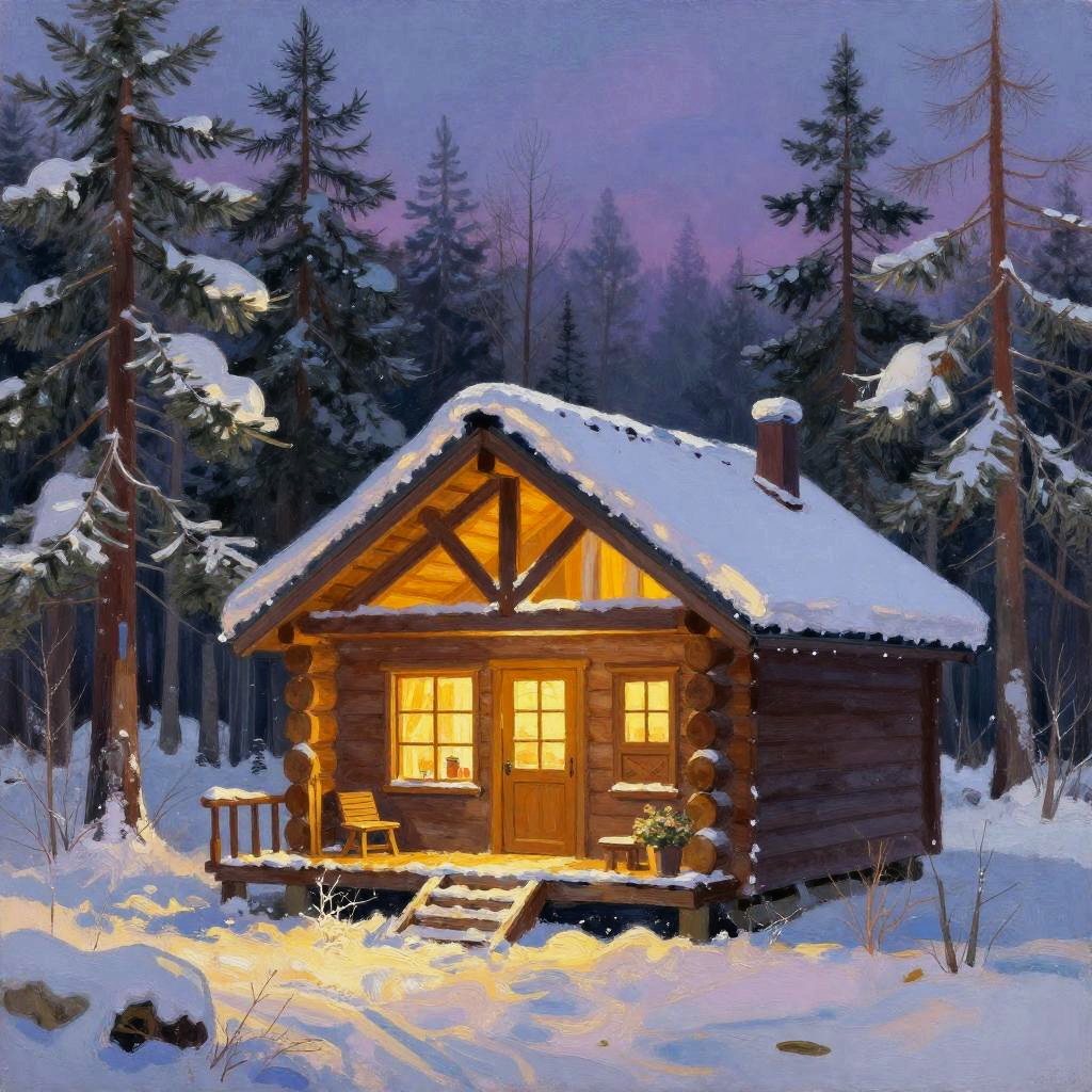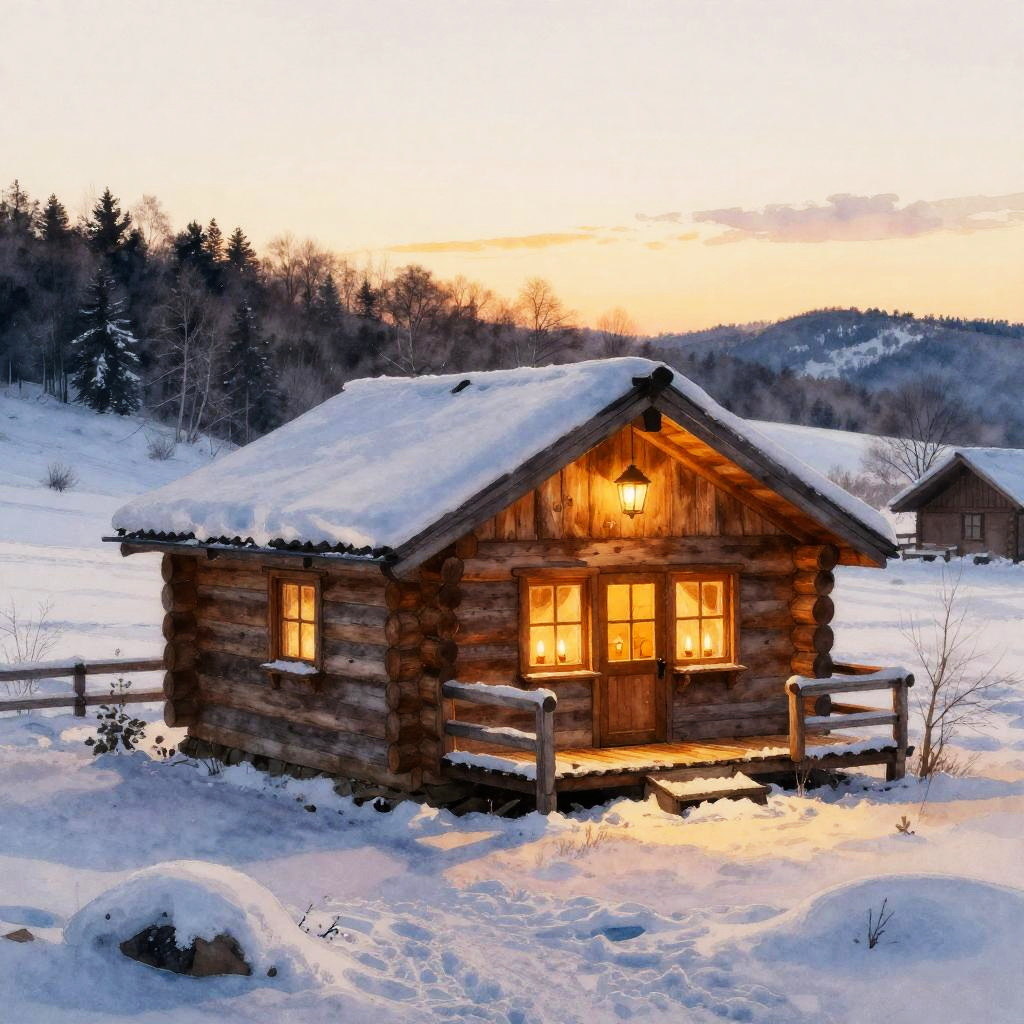A cozy, snowy-covered log cabin nestled among rolling hills with powdery snow, with cheerful candlelight shining through panes, glowing warmly from inside, set against a late golden hour sunlight, in a loose watercolor painting