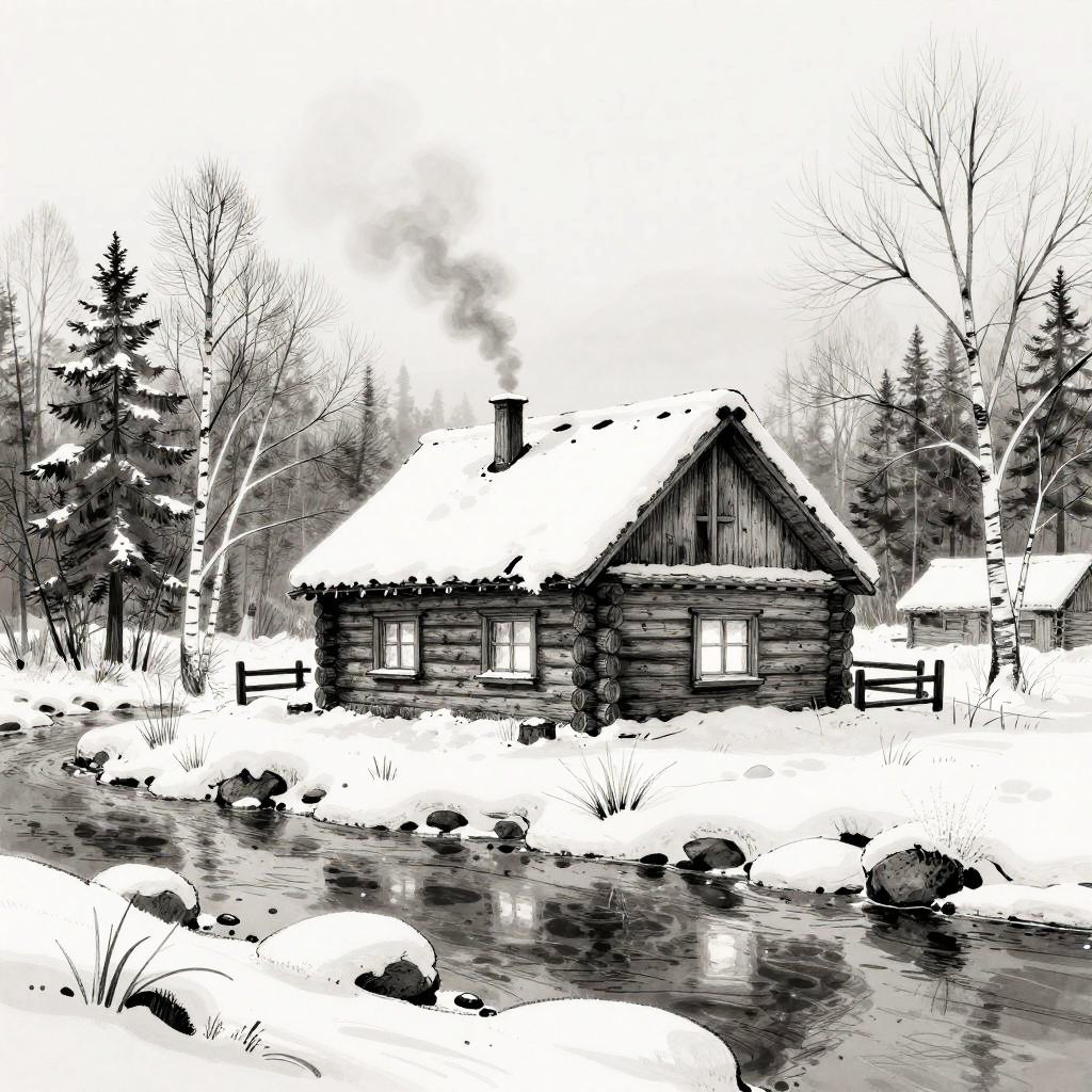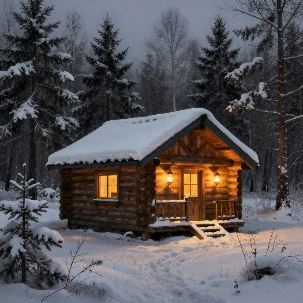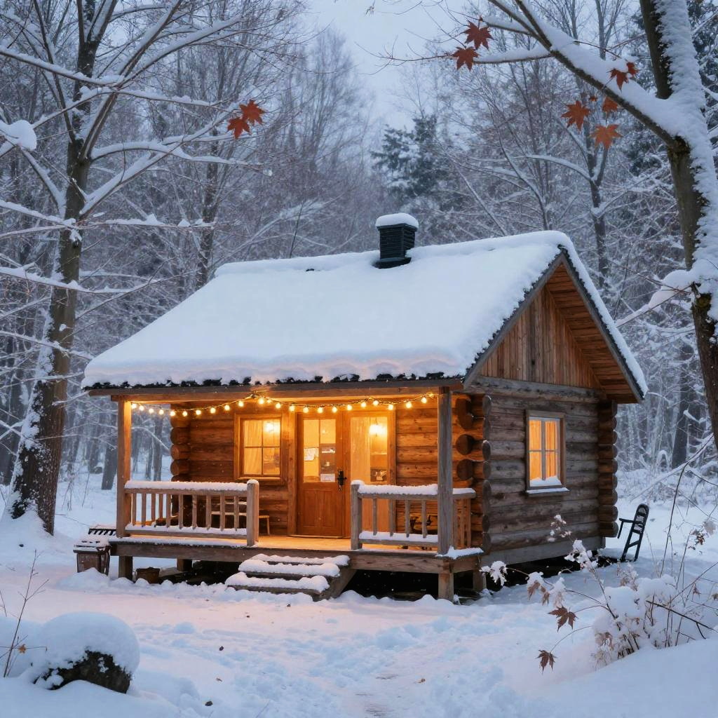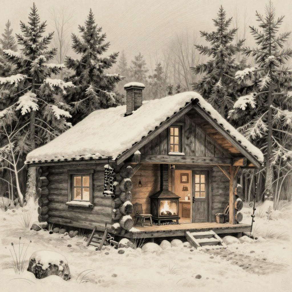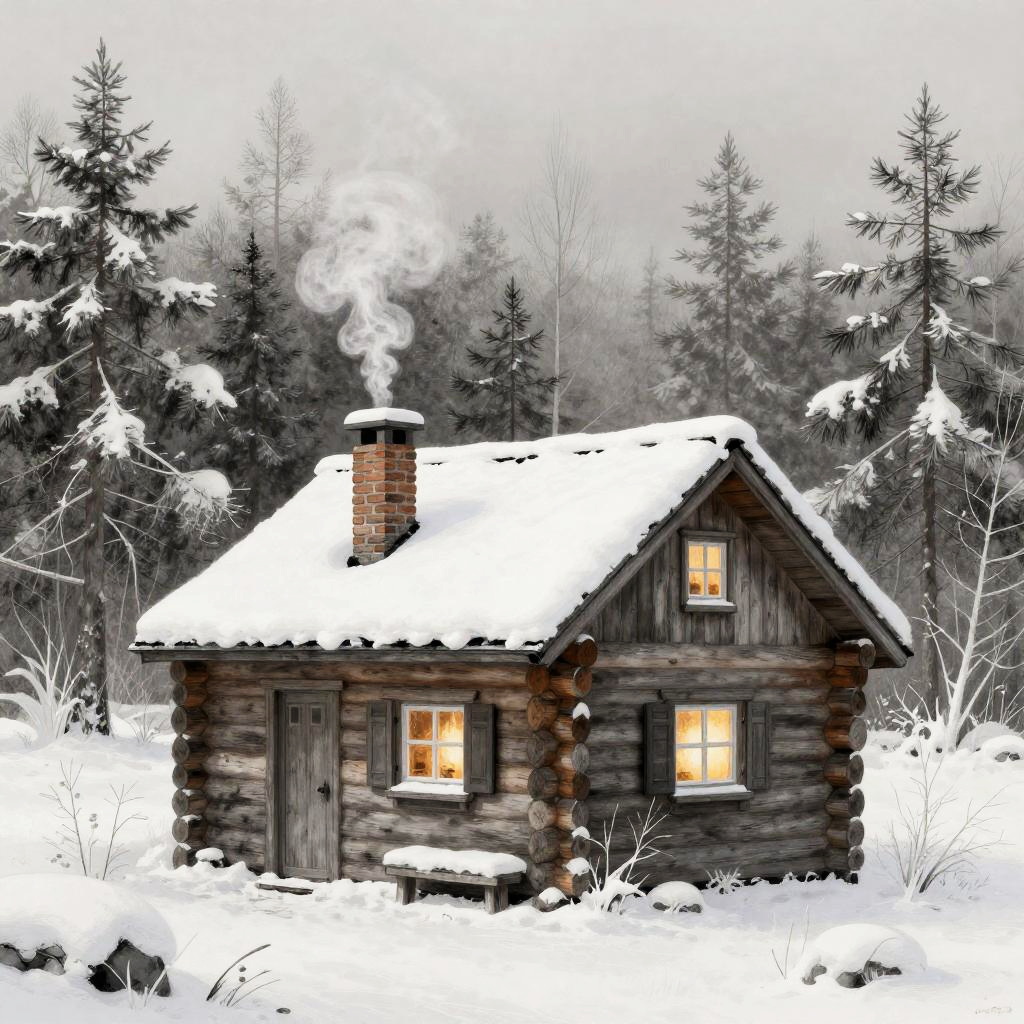 A cozy, snowy-covered log cabin nestled among rolling hills with powdery snow, with cheerful candlelight shining through panes, glowing warmly from inside, set against a late golden hour sunlight, in a loose watercolor painting