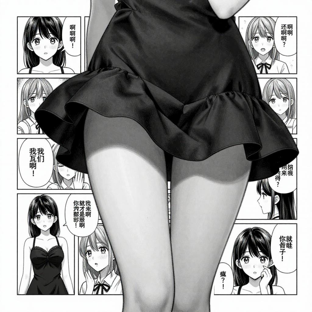 This black and white manga-style digital drawing features a close-up of a woman's lower body, focusing on her black, short, flared skirt that reveals her upper thighs. The background is filled with several smaller manga panels depicting various expressions of the same woman with different hairstyles and outfits. The woman's skin is light, and she has a slender physique. The panels include speech bubbles with Chinese text. The drawing uses strong contrasts and fine lines typical of manga art. The central image dominates the composition, with the smaller panels arranged symmetrically around it.