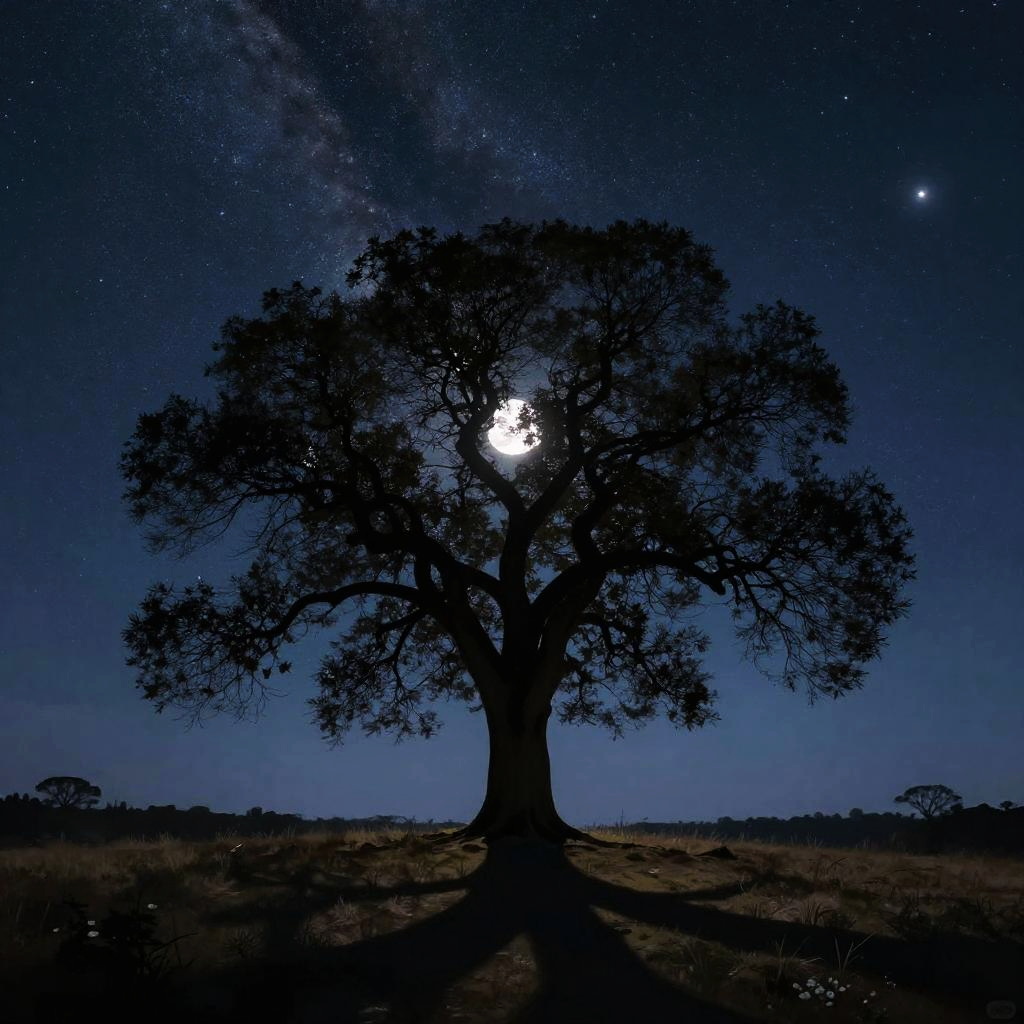 Arbol sycamore standing alone on a hill under a starry night sky, silhouette against the Milky Way, calm and majestic mood, soft moonlight casting shadows, digital painting