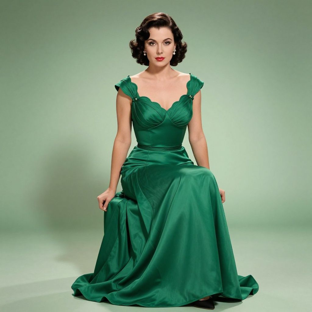 Woman wearing an elegant emerald green satin evening gown with scalloped neckline and floor-length skirt. She has a wavy dark brunette bob hairstyle and wears pearl earrings, embodying classic Hollywood glamour in a formal seated pose against a soft gradient green background.