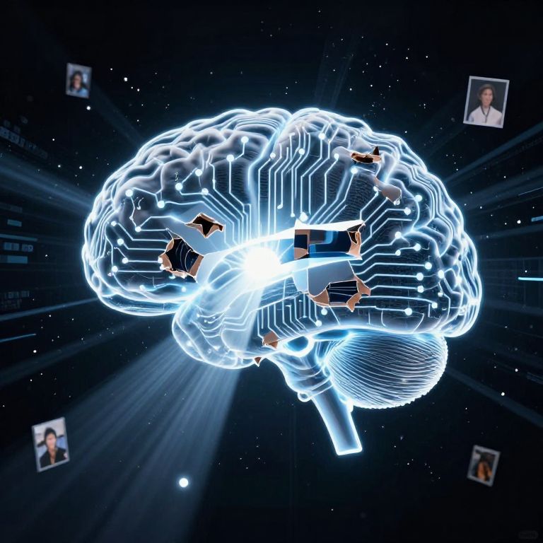 Digital CGI of a glowing, neon-blue brain with circuitry, surrounded by dark space, featuring floating profile pictures.
