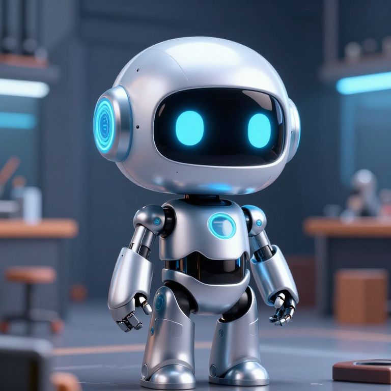 Avatar 3d maker generating a cute robot companion, sleek metallic surfaces with blue LED accents, expressive digital eyes, friendly posture, futuristic workshop backdrop, high detail with soft reflections and depth of field