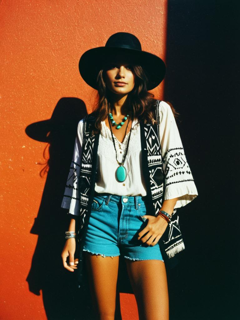 Woman, Bohemian, white loose-fitting blouse with three-quarter length sleeves, denim cutoff shorts, black and white tribal print open vest, wide-brimmed black felt hat, turquoise pendant necklace, minimalist silver bangle, layered thin bracelets. --sref 1388