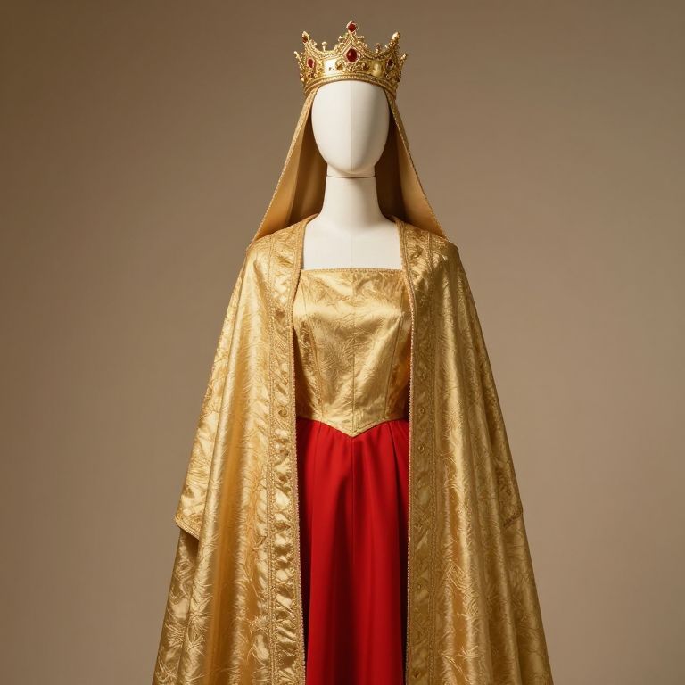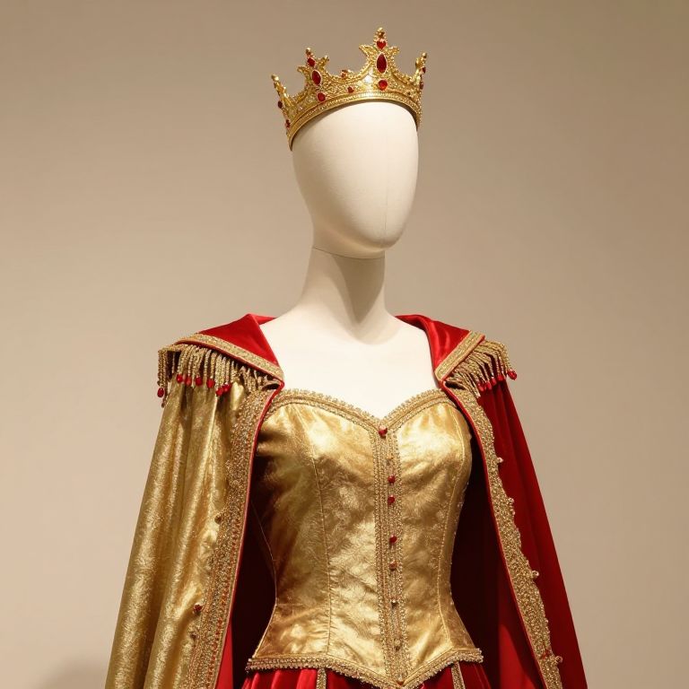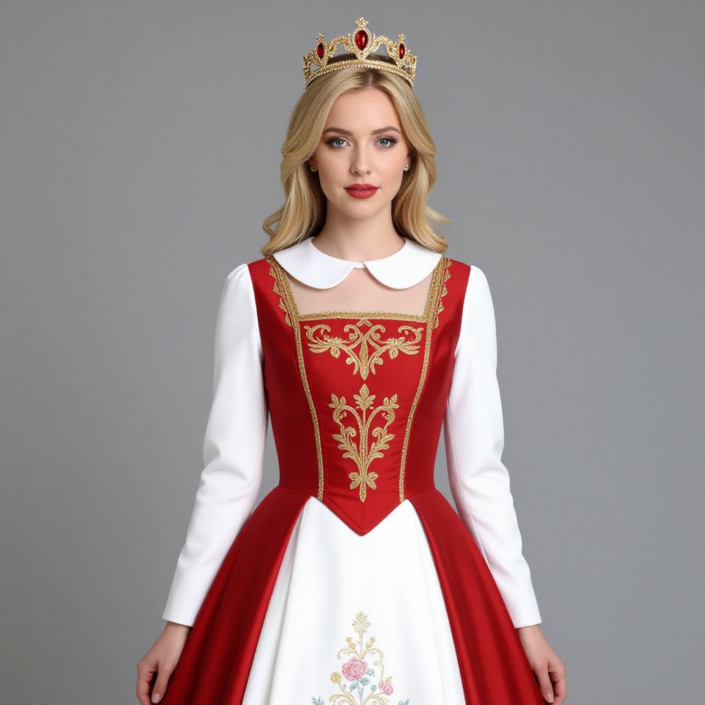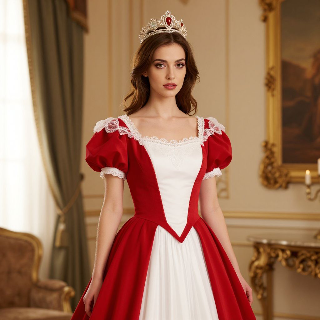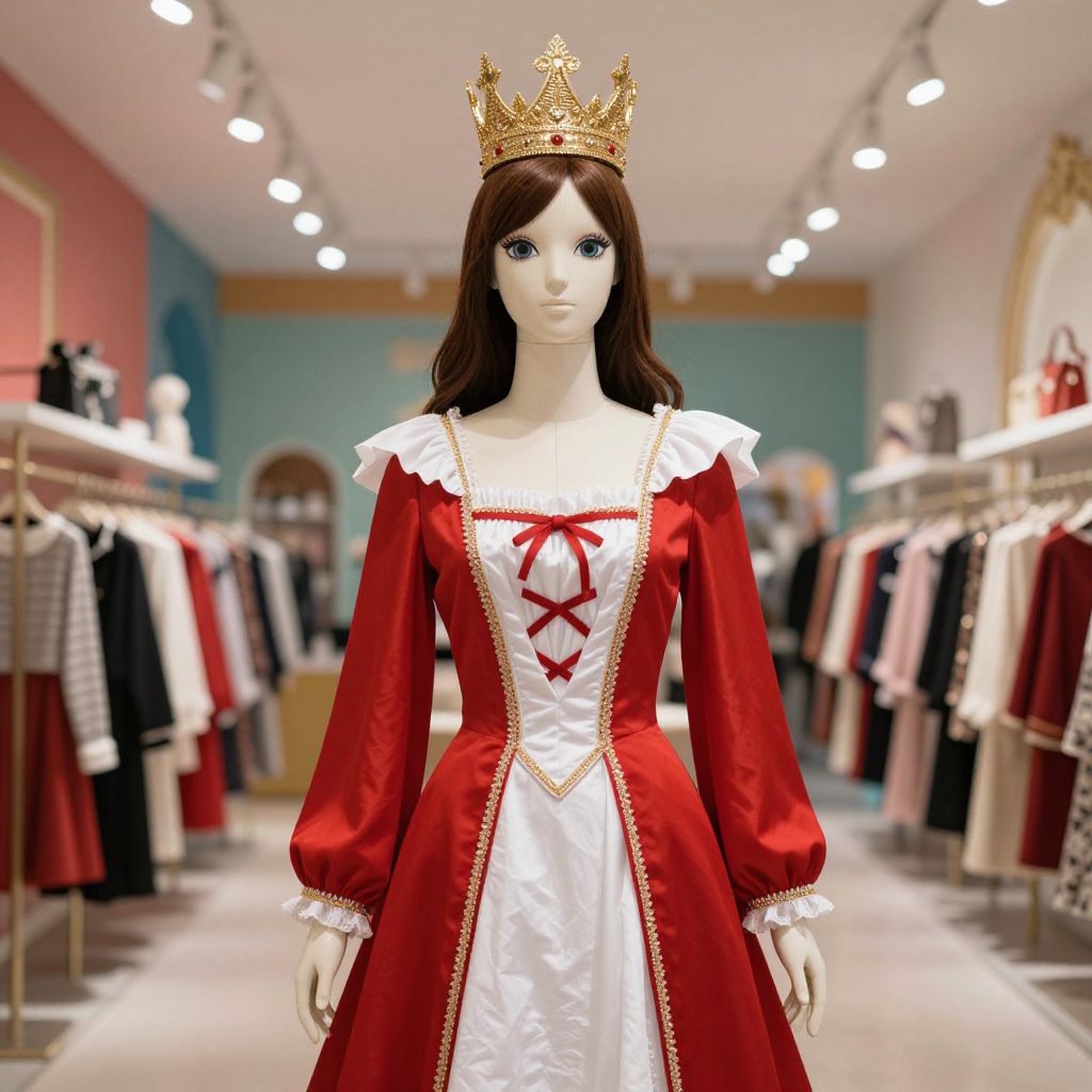 A mannequin dressed in a detailed red and white costume, featuring elegant red fabric with white trim and accents, standing upright with a golden crown resting on its head. The mannequin has a stylized, slightly stylized face with expressive, large eyes and a neutral expression, giving it a lifelike yet artistic presence. The scene is set in a vibrant, stylized retail store interior with soft lighting and reflective surfaces, emphasizing the rich colors and intricate details of the costume. The overall atmosphere is festive and theatrical, blending fashion and fantasy.