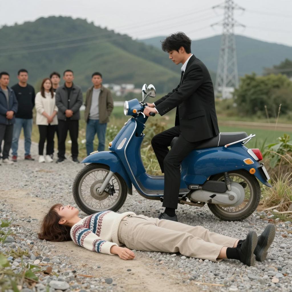 A stage scene with five people. A man in a white shirt and bloody apron stands on the left. A man in a gray suit stands in the center, looking down at a man lying on a metal gurney. The man on the gurney is unconscious, wearing a white shirt, red vest, and black pants. Two shadowy figures stand in the background. Bright blue stage lights illuminate the scene. The background includes a "POLICE" sign.
