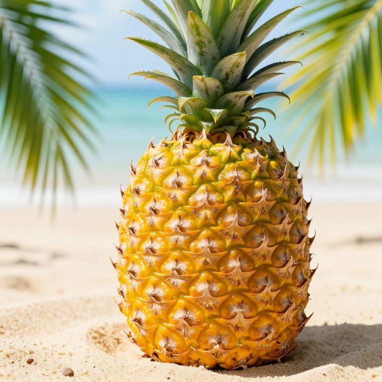 Pineapple on a tropical beach, vibrant yellow and green hues, detailed texture of the rough skin, surrounded by palm leaves and bright sunlight, photorealistic style, high resolution