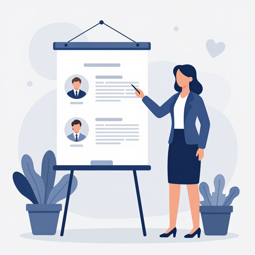 A flat vector illustration depicts a professional woman presenting a customer relationship management system on a flip chart, featuring profiles and text, set against a minimalist background with subtle lighting effects and decorative elements like a potted plant and heart symbol.