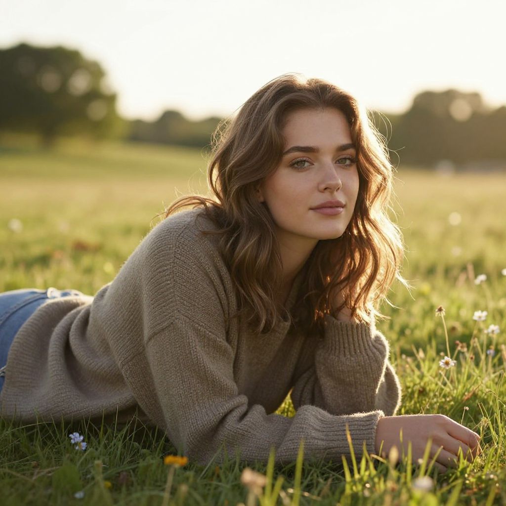 Photograph of a young woman lying on her stomach in a sunlit grassy field. She has wavy, shoulder-length brown hair, light skin, and is wearing a beige, chunky knit sweater and blue jeans. Her expression is relaxed and she gazes slightly to the right. The golden sunlight creates a warm glow, highlighting her face and casting soft shadows. In the background, the field is blurred with green grass and scattered small flowers. Trees are visible in the distant background, bathed in sunlight. The overall mood is serene and natural.