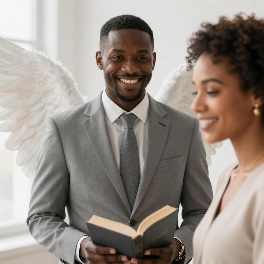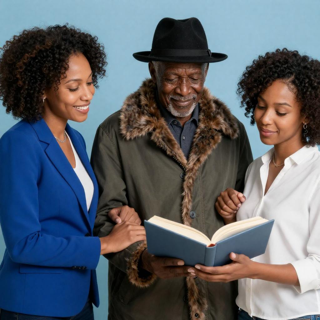 Photograph of three people. Left: African-American woman with curly hair, blue blazer, smiling, holding hand. Center: Older African-American man with dark skin, black hat, fur-trimmed coat, smiling. Right: African-American woman with curly hair, white blouse, holding child's hand, looking at open book. Background: blue ured pattern.