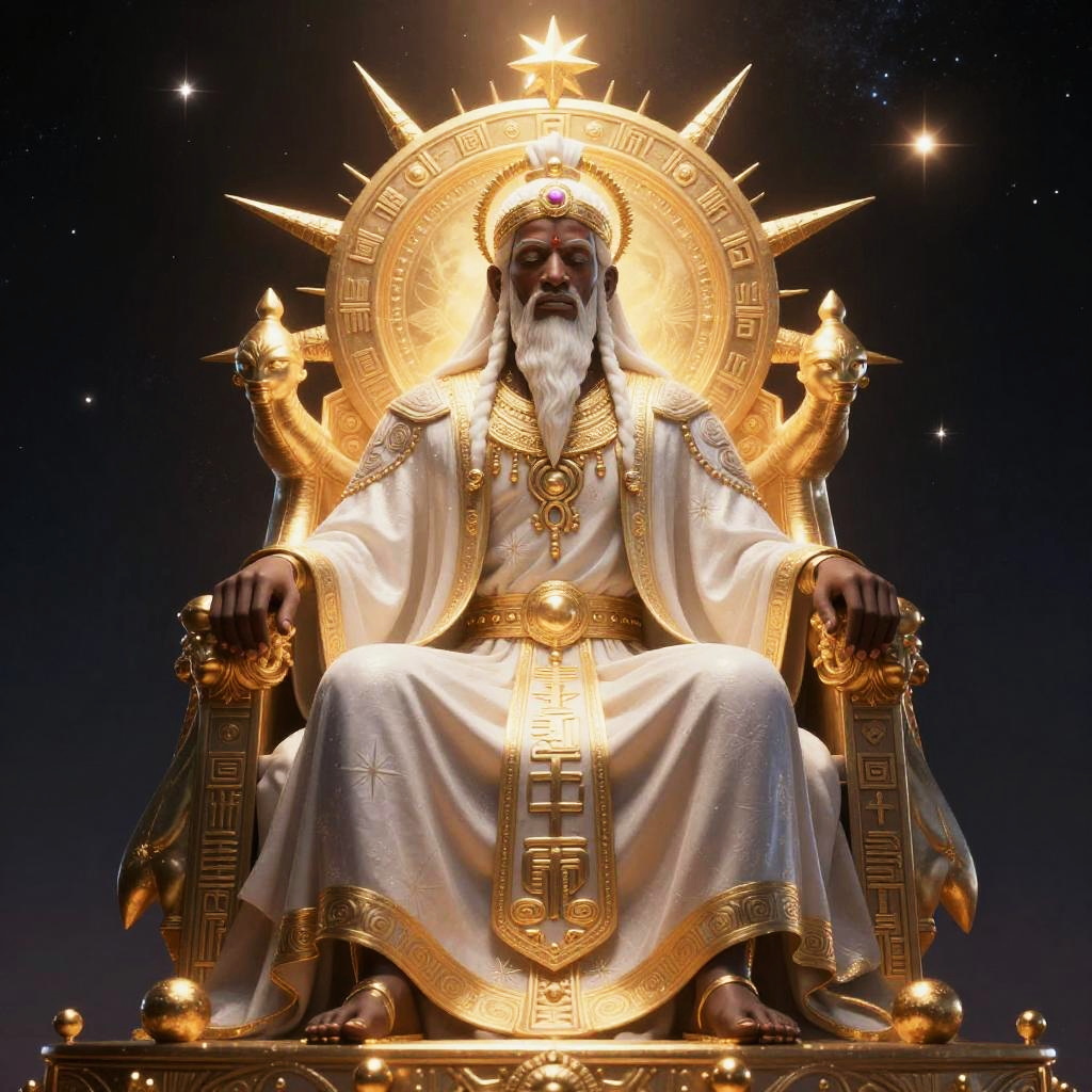 Onyankopon as a wise cosmic being seated on a throne of stars and ancestral symbols, radiant aura illuminating dark space background, intricate details on robes, mystical and powerful, high resolution digital art.
