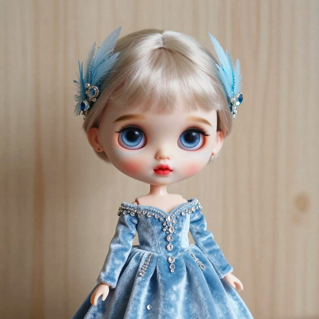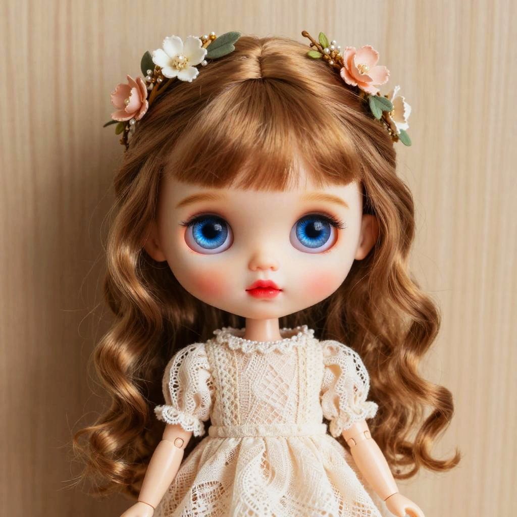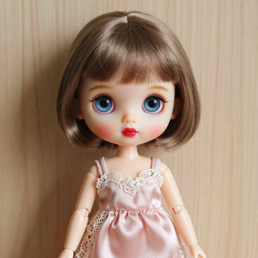 A highly detailed portrait of a doll with large expressive blue eyes and smooth porcelain skin, softly lit to highlight delicate facial features. The doll has light ash brown bob with side swept bangs and wears a blush pink satin slip dress with delicate lace trim, standing against a warm beige wooden background. The style is realistic and doll-like, with subtle blush on the cheeks, bright red lips, and intricately detailed shading and textures.