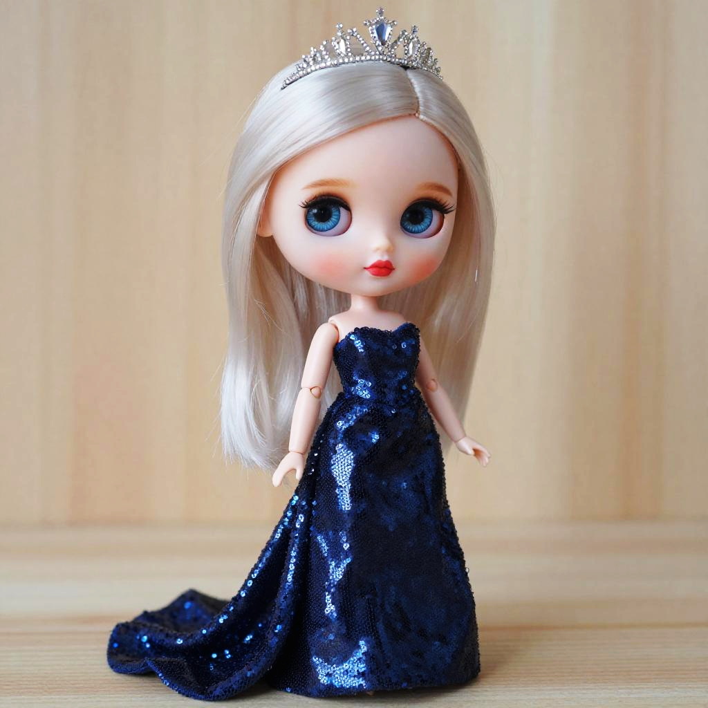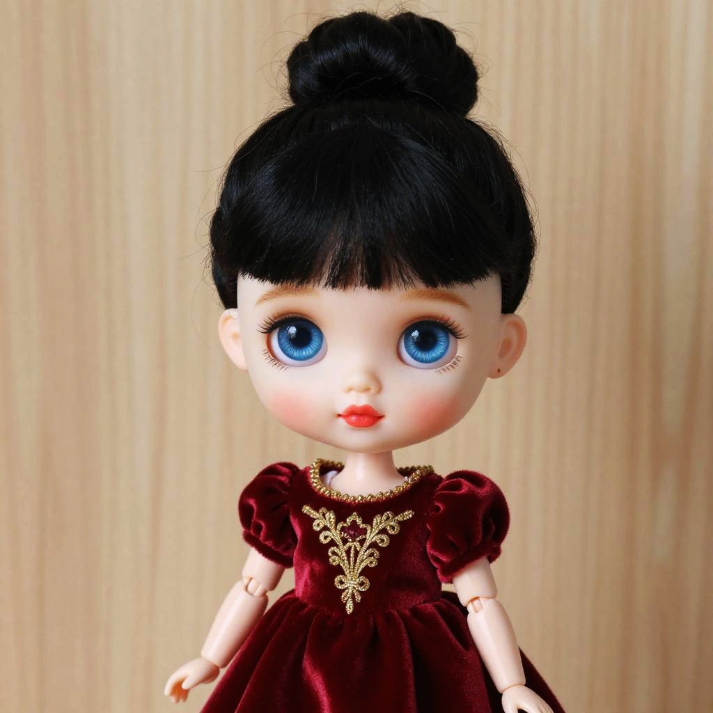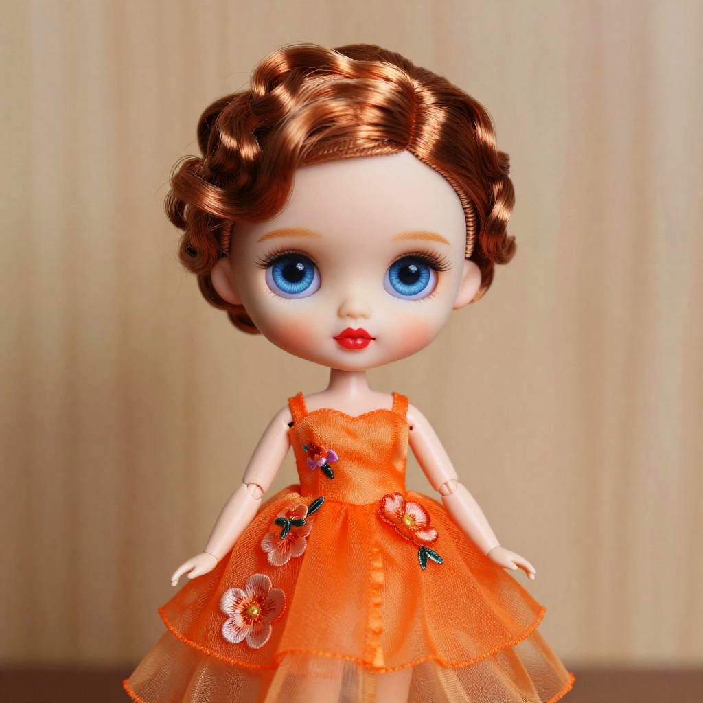 A highly detailed portrait of a doll with large expressive blue eyes and smooth porcelain skin, softly lit to highlight delicate facial features. The doll has light ash brown bob with side swept bangs and wears a blush pink satin slip dress with delicate lace trim, standing against a warm beige wooden background. The style is realistic and doll-like, with subtle blush on the cheeks, bright red lips, and intricately detailed shading and textures.
