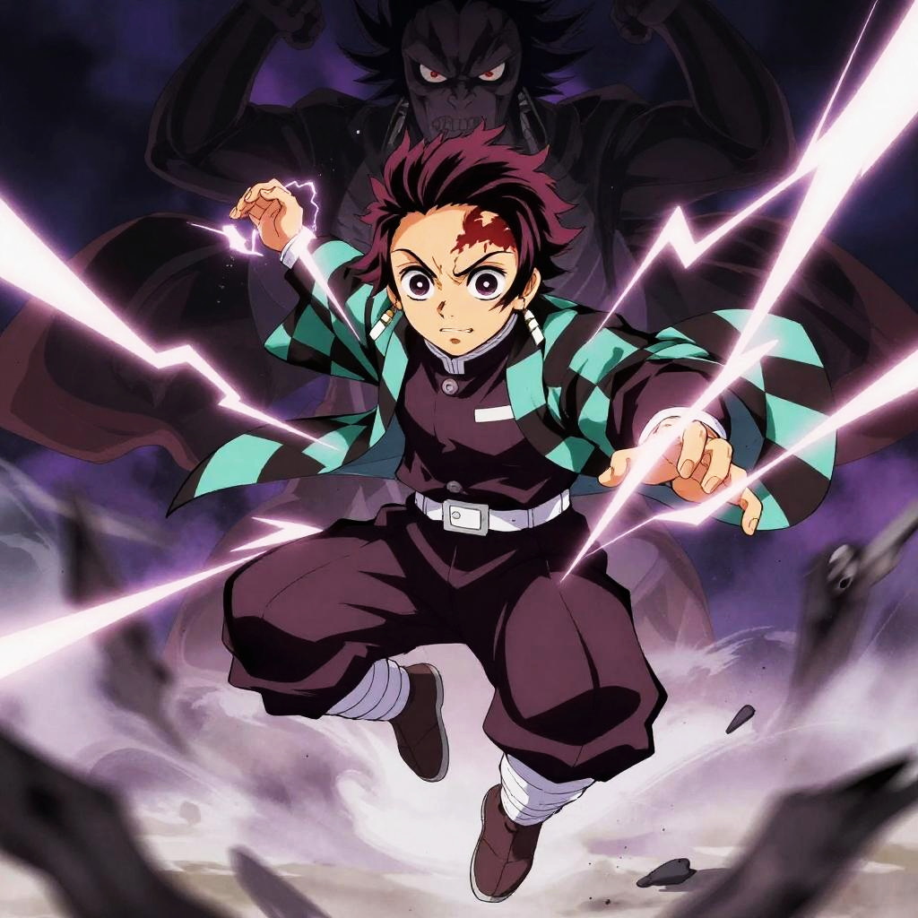 Demon Slayer AI filter rendering a battle-ready anime fighter with stylized hair and armor, surrounded by swirling data streams and glitch effects, combining traditional ink brush textures with futuristic digital overlays in a vivid neon color palette.