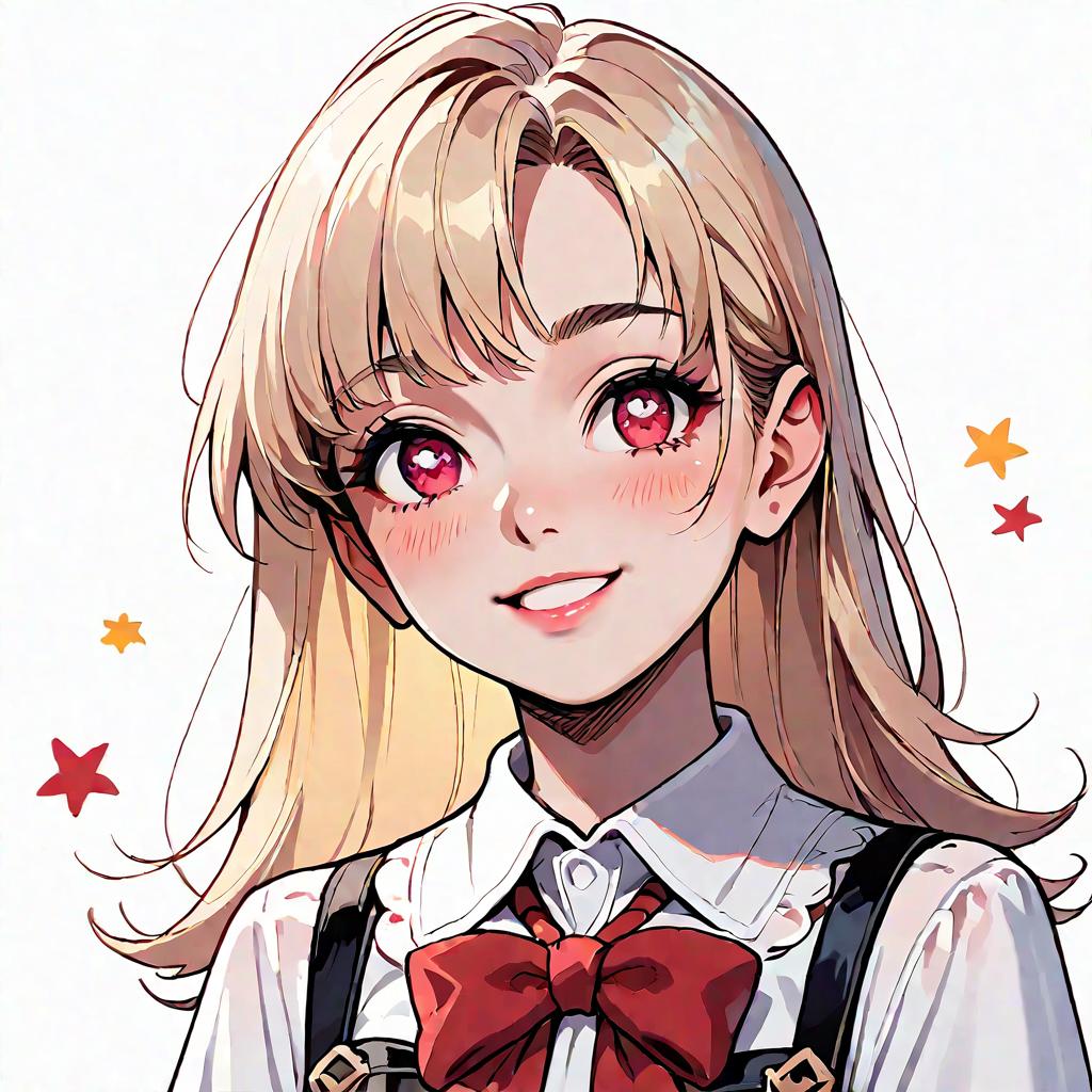 Digital illustration of an anime-style young girl with long blonde hair, red star-shaped pupils, and light blush on her cheeks. She wears a white blouse with long sleeves and a prominent red bowtie, set against a simple white background with small colorful stars.