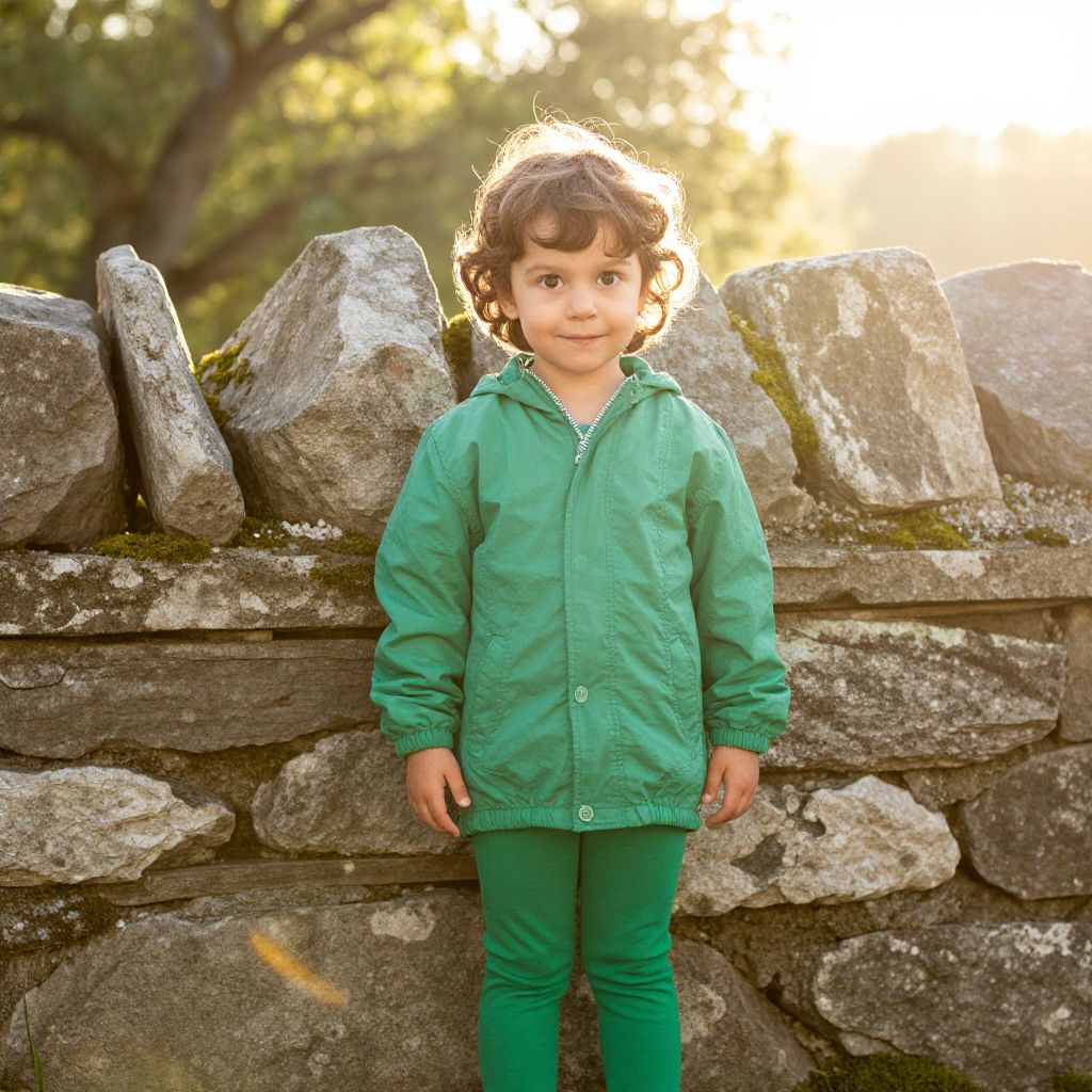 A young child, around 6 years old, is wearing a bright green outfit with a hooded jacket and green leggings, standing confidently in front of a weathered stone wall. The child has curly brown hair, big expressive eyes, and a slightly mischievous smile. The stone wall is made of rough, natural stone with moss growing on its surface, and the background features a soft, sunny morning with warm golden light filtering through the trees. The scene is peaceful and slightly whimsical, capturing a sense of quiet adventure and curiosity.