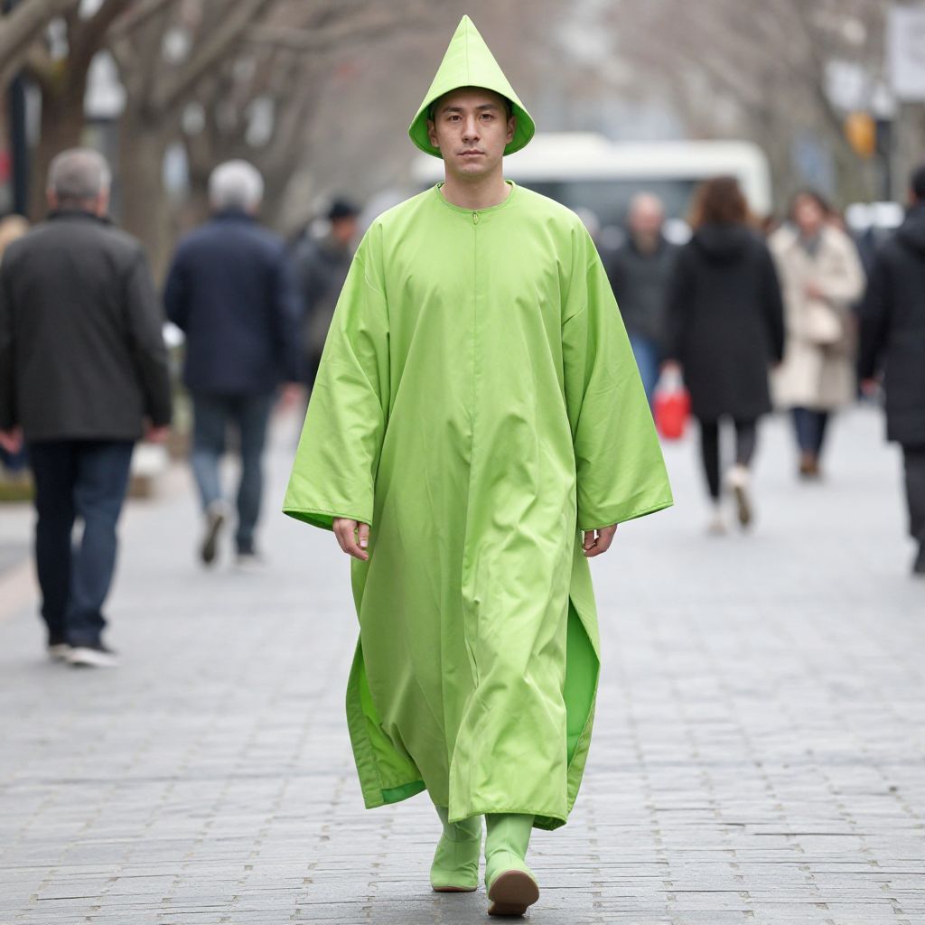 Lime Green Among Costume, man in a green robe and hat walking down a street