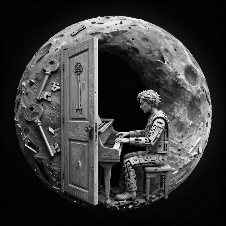 On a moon made of shattered keys, a pianist plays melodies that unlock forgotten doors in listeners’ minds.