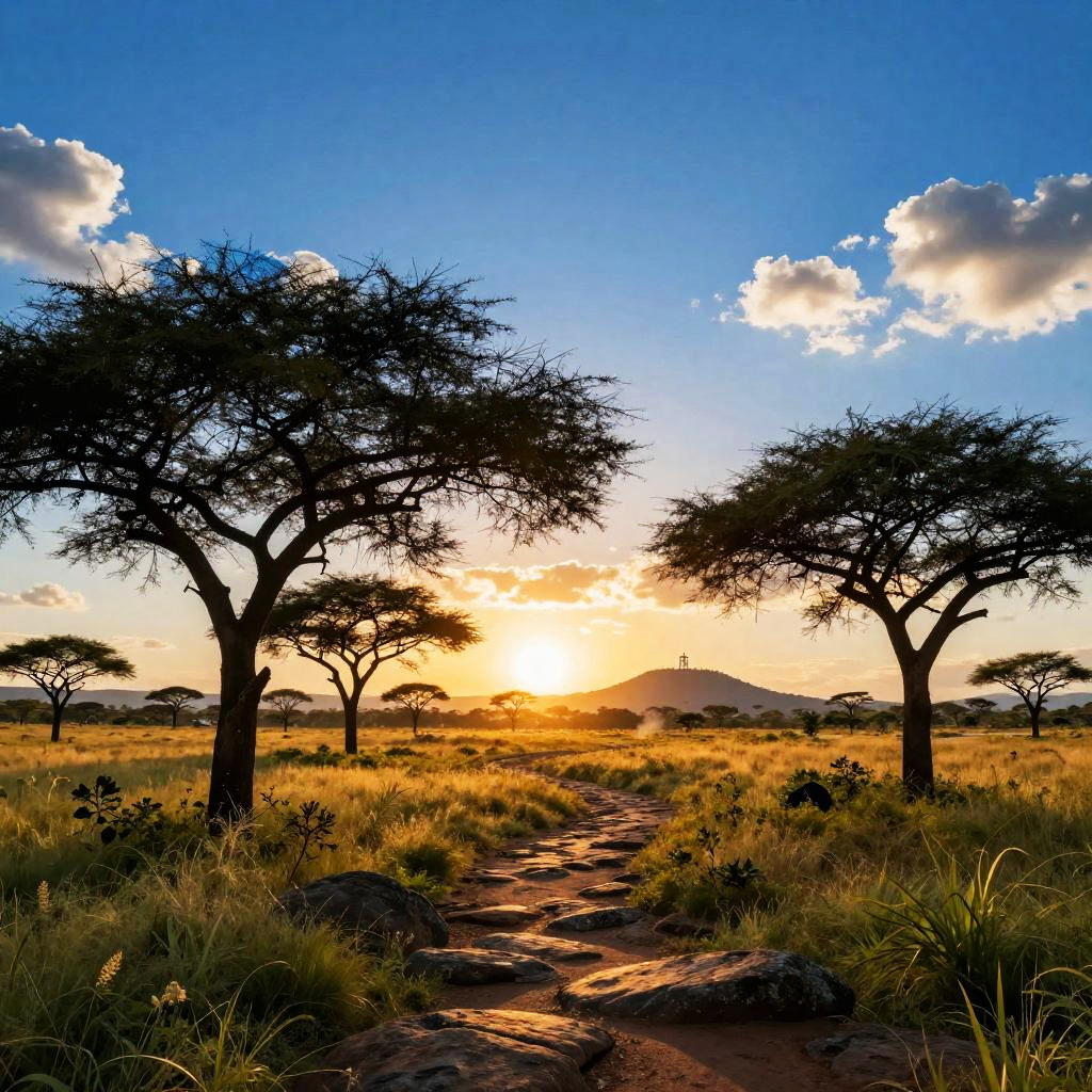High contrast silhouette art landscape set in sunset savanna with acacia trees, bright blue sky with fluffy clouds. Oversized blue-tinted shapes frame a rocky path winding into a glowing golden field; a small landmark rests on a distant hill amid lush greenery. Saturated palette, crisp outlines, dithered textures, soft bloom, subtle fog, playful particles, storybook charm, peaceful and expansive.