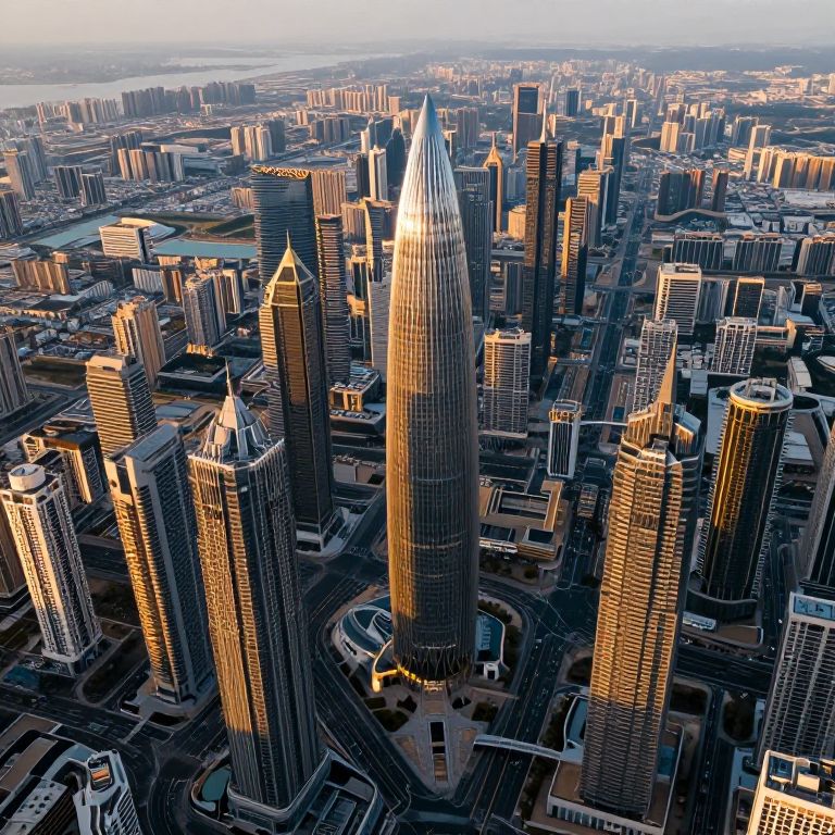 The image presents a hyperrealistic aerial view of a futuristic linear city, characterized by an intricate network of towering skyscrapers and sleek, modern architecture. The cityscape is densely packed with high-rise buildings, their facades illuminated in a warm, golden hue that contrasts with the cool tones of the surrounding structures. The tallest building, a sleek, pointed structure, stands out prominently in the center, serving as a focal point amidst the sea of skyscrapers. The city's layout is organized in a linear fashion, with roads and waterways forming a grid-like pattern that extends into the distance. The interplay of light and shadow creates a sense of depth and dimension, highlighting the intricate details of the buildings and the smooth, reflective surfaces of the skyscrapers. The overall composition is balanced, with the city's elements arranged in a harmonious yet dynamic manner, capturing the essence of a bustling, technologically advanced metropolis.