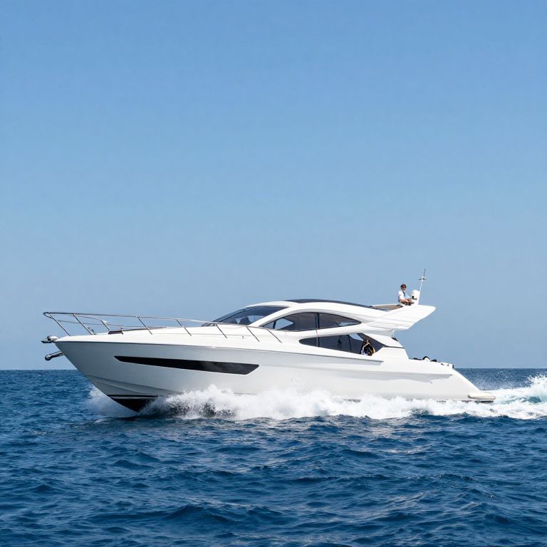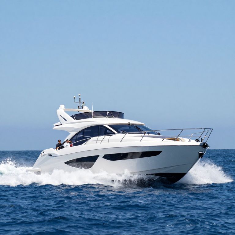 Speedy INFINITY V3 yacht cruising at 17 knots, leaving a trail of white spray as two individuals navigate its sleek design under a clear blue sky.