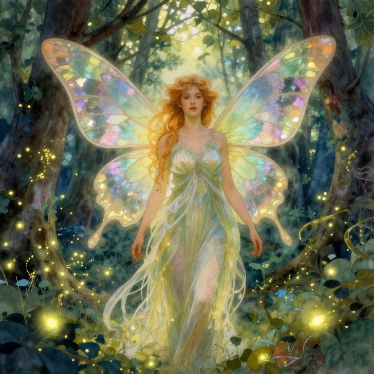 An exquisite portrait of a celestial fairy queen, bathed in the gentle luminescence of fireflies within an enchanted forest clearing. This whimsical subject is rendered with the delicate and intricate style reminiscent of Alphonse Mucha's watercolor paintings, evoking an atmosphere of grace and mystery. The artwork beautifully captures the fairy's translucent wings in a mesmerizing array of iridescent colors, reflecting the fragmented light filtering through the lush canopy above as she presides over her mystical realm, inspiring both awe and reverence from those fortunate enough to witness this enchanting scene.
