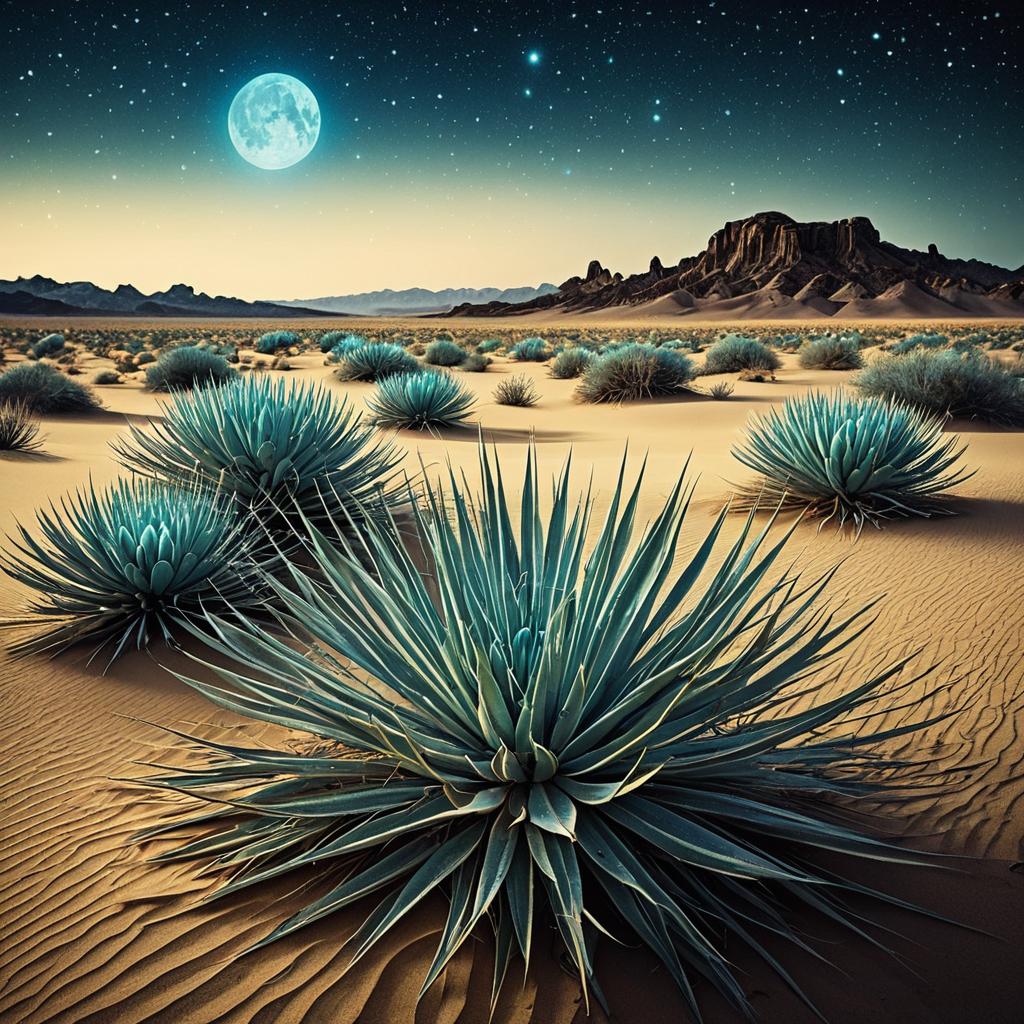 A surreal and peaceful desert landscape featuring bioluminescent plants with glowing blue-green hues scattered across sandy dunes. The scene is illuminated by a bright full moon and a starry night sky, with rocky formations in the distant background. The image is highly detailed and intricate, capturing a dreamlike atmosphere.