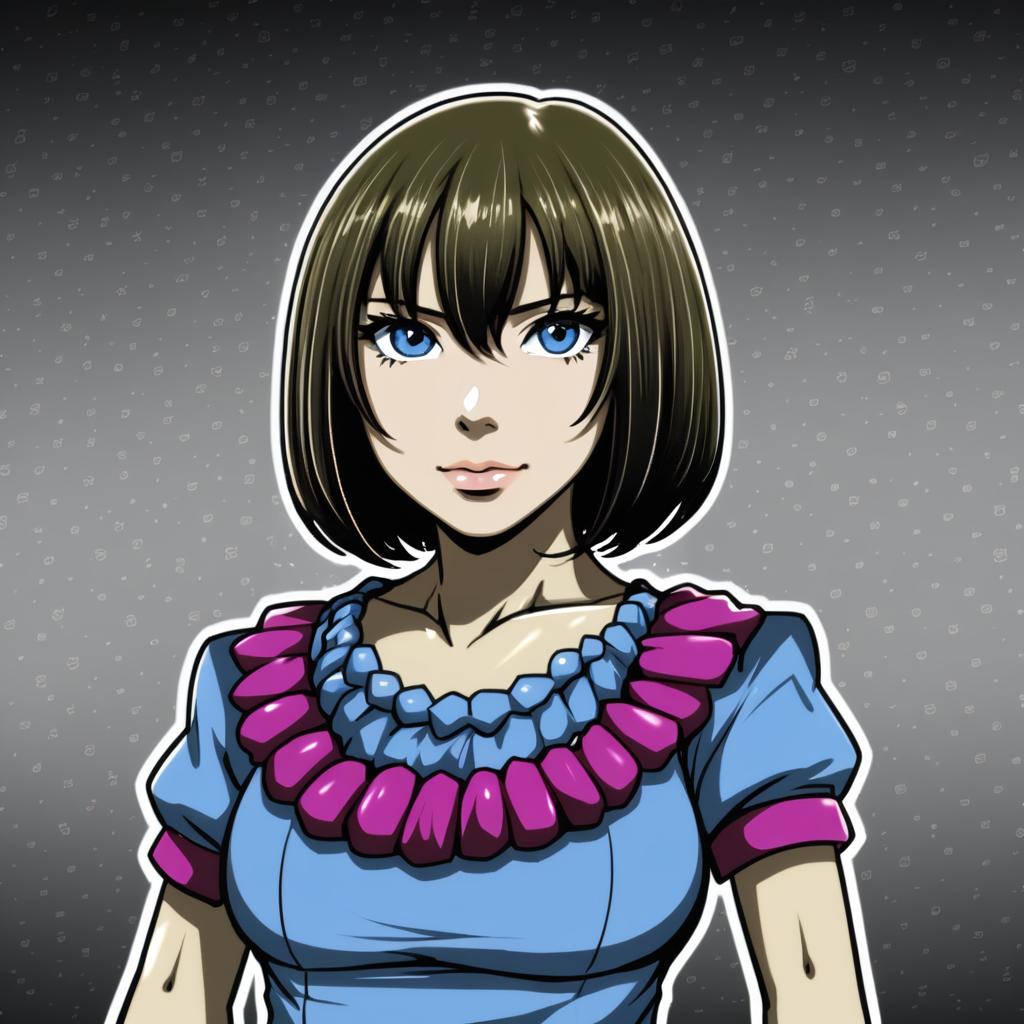 Digital illustration of an anime-style young woman with short brown hair and striking blue eyes. She is wearing a blue dress adorned with a large necklace featuring blue and magenta beads. The background is a gray gradient with subtle textured patterns.