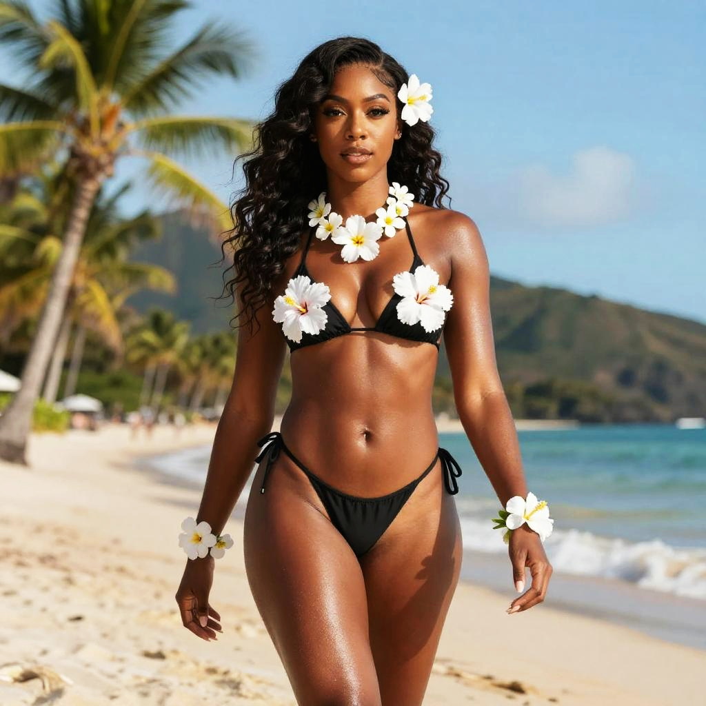 Photograph of a confident Black woman with curly hair, wearing a white bikini, walking on a sunny, palm-tree-lined tropical beach with clear blue ocean