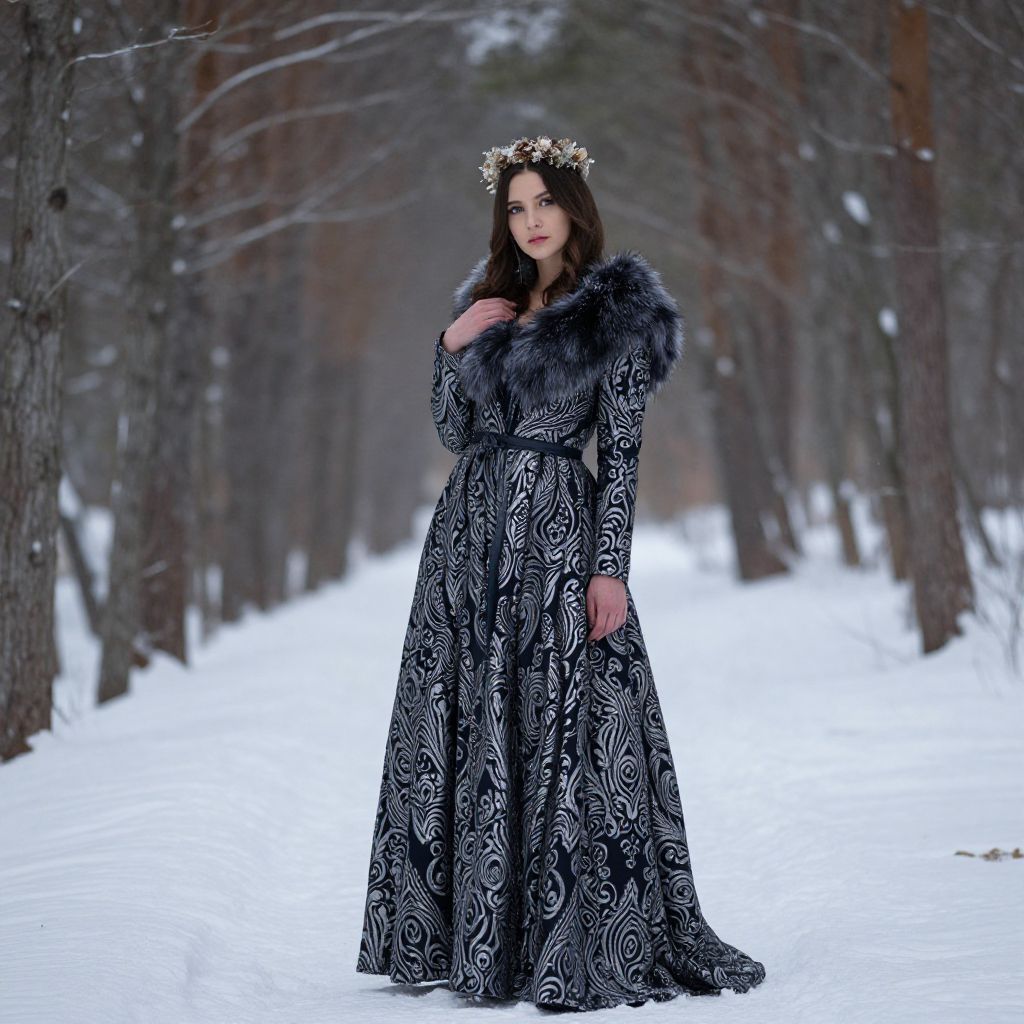 A young woman stands gracefully in a snow-covered forest, dressed in an elegant, long dark gown with intricate silver patterns and a fur-trimmed collar. She wears a delicate floral crown, adding a touch of ethereal fantasy to the serene winter scene, captured in a realistic, moody style.