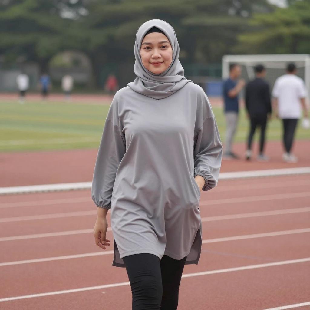 Photograph of an Asian woman with fair skin and a curvy physique, wearing a gray hijab and loose, gray tunic over black leggings. She stands on a red track field, smiling slightly, with blurred people and greenery in the background. Her right hand rests in her tunic pocket.