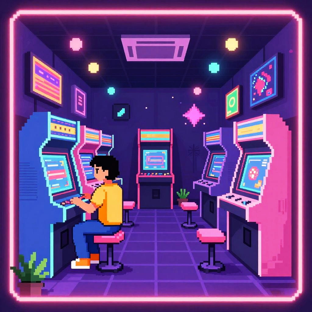 Pixel anime style calm quantum archaeologist with glowing hologram map in ancient neon-lit ruins beneath a digital sky, soft indigo and emerald fluorescence with subtle flickers, vibrant neon highlights reflecting on wet streets, detailed pixel art with crisp dithering, expressive face despite minimal pixels, dynamic shading, reflective puddles, subtle parallax layers, isometric or side-scroller composition cues, balanced 16/32-bit palette, cinematic yet readable sprite silhouette, atmospheric steam and signage, SDXL-friendly composition