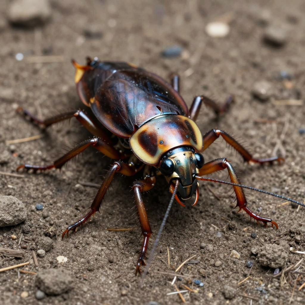 Best quality, masterpiece, ultra high res, absurdres, (a best close-up photo of teals steel Cockroach with 8 legs and 6 eyes and cheliceraes), biomechanical, mshn robot, hyper realistic, steel, intricate design, insanely detailed, fine details, on the dirt ground