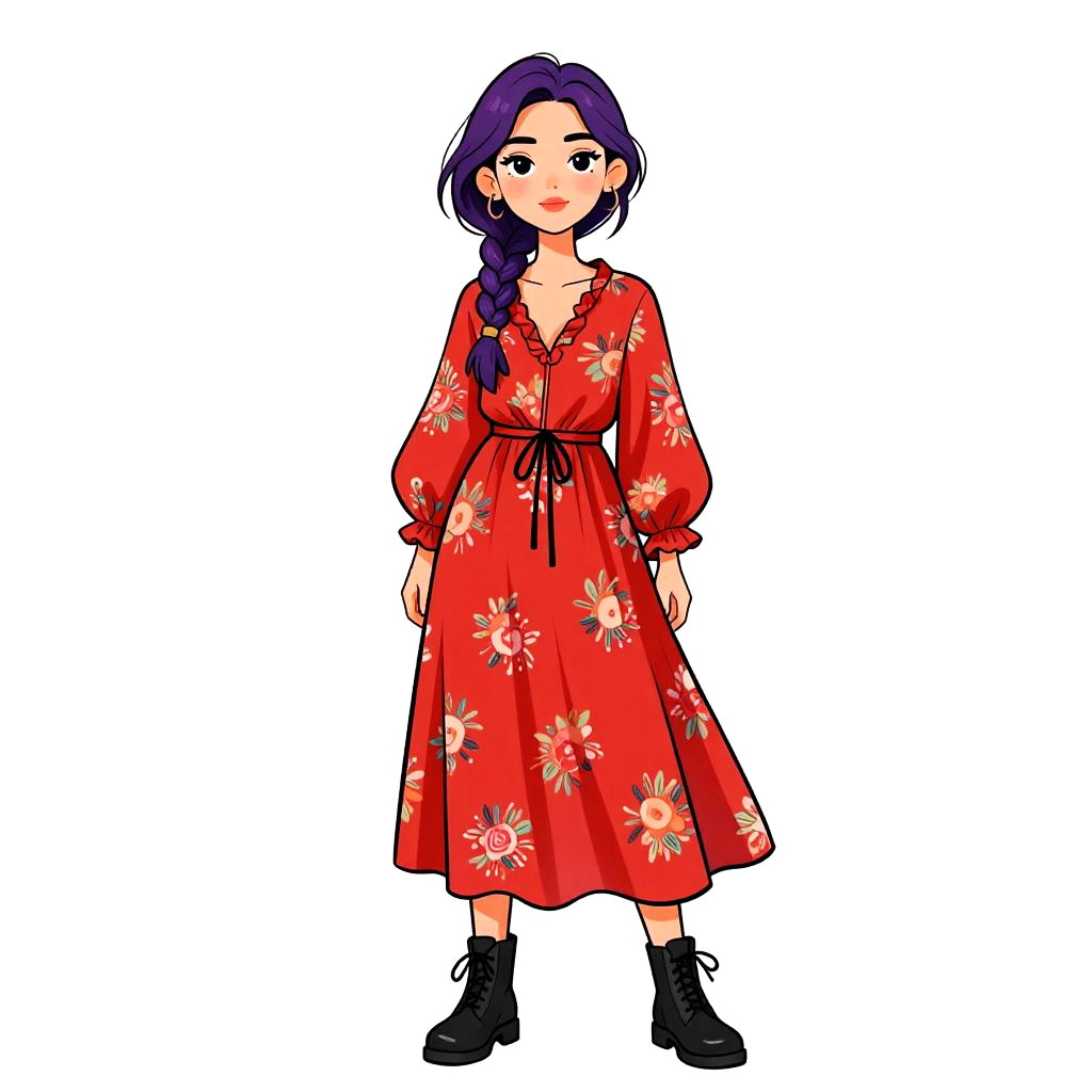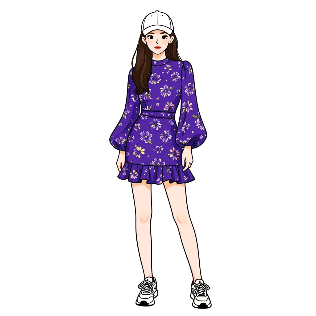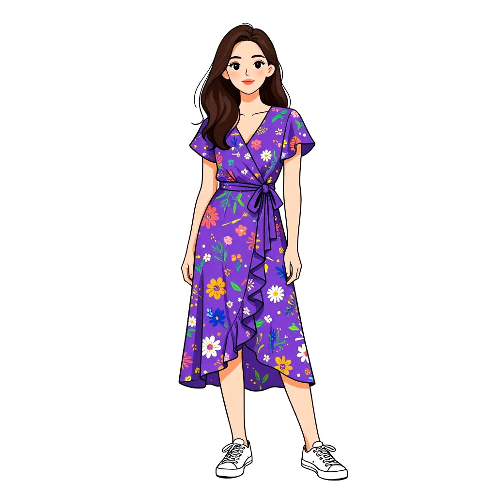 Woman with pretty face and pretty hair. Woman, casual daytime, floral print midi dress in multicolor, short flutter sleeves, V-neckline, cinched waist with a tie belt, ruffle detailing along the front, asymmetrical hem, paired with white low-top sneakers, plain white background. --sref 1467