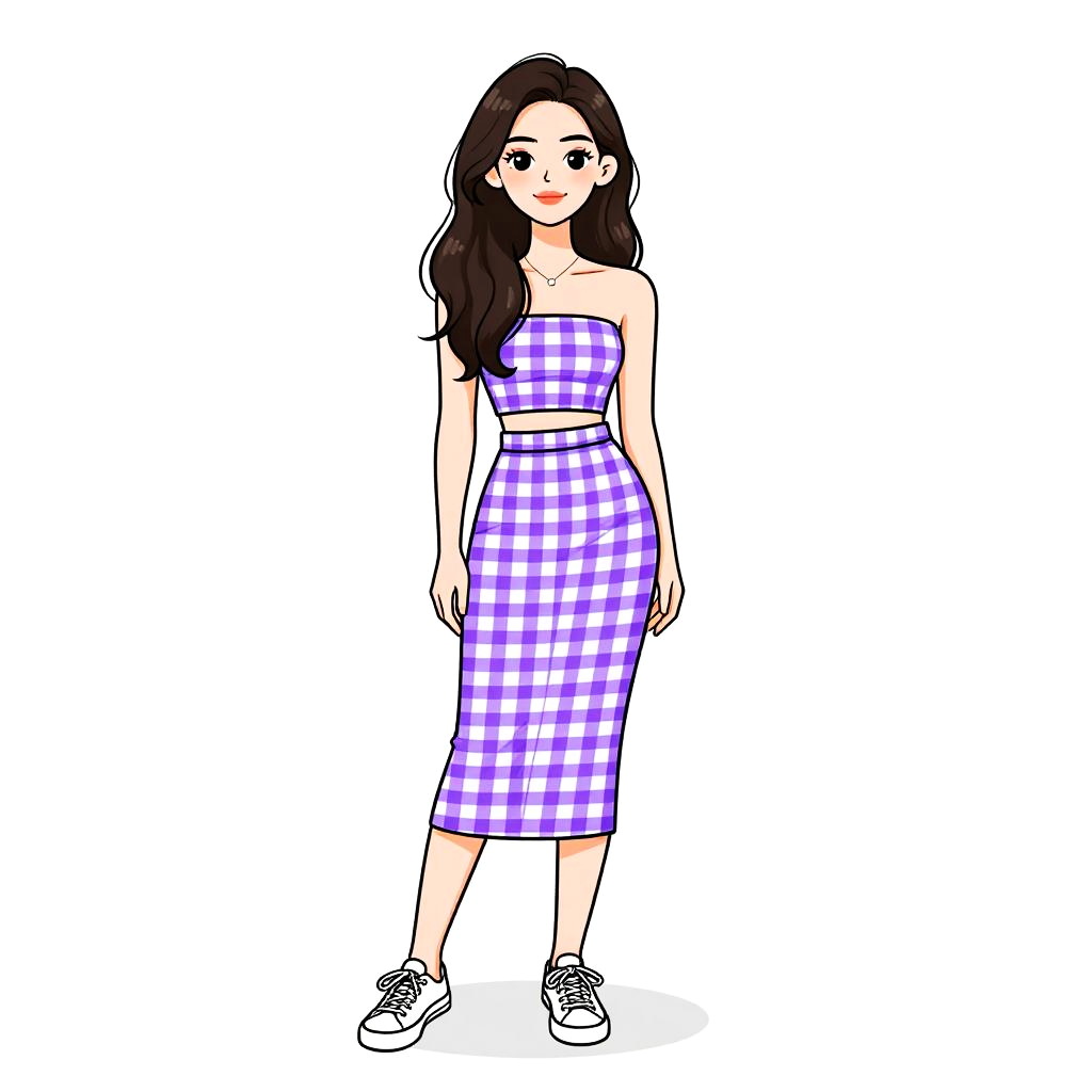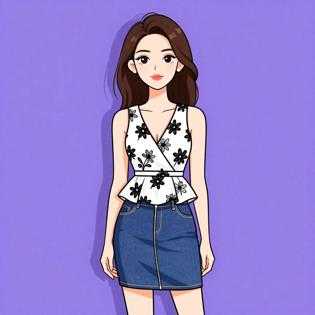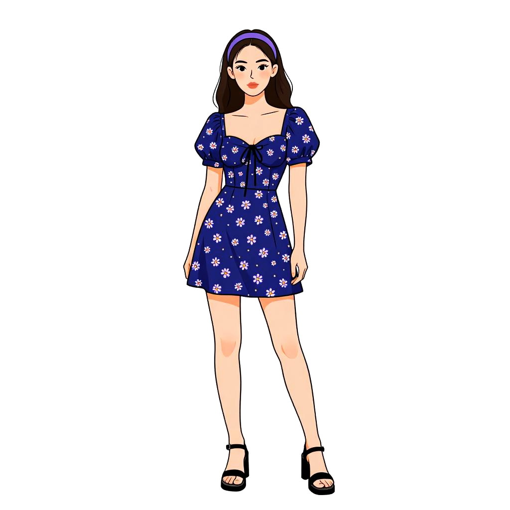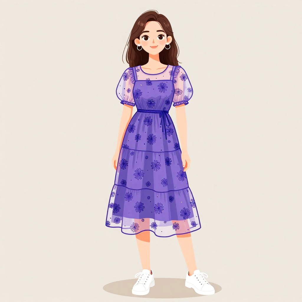Woman with pretty face and pretty hair. Woman, casual daytime, floral print midi dress in multicolor, short flutter sleeves, V-neckline, cinched waist with a tie belt, ruffle detailing along the front, asymmetrical hem, paired with white low-top sneakers, plain white background. --sref 1467