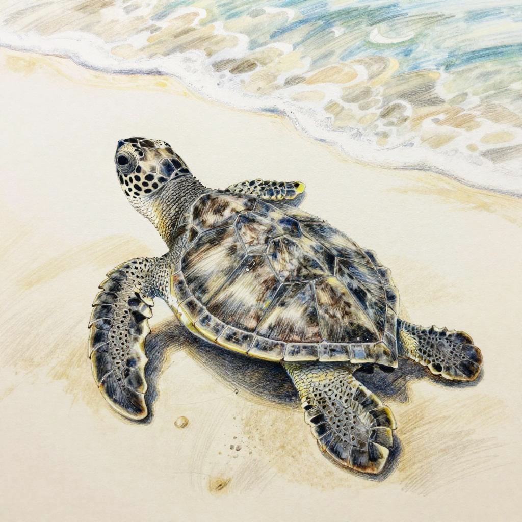Close-up realistic baby sea turtle drawing, fine pencil strokes capturing the rough shell and delicate limbs, naturalistic ocean shore setting in muted pastel colors, gentle waves in background, soft shadows emphasizing the 3D depth of the turtle's form.