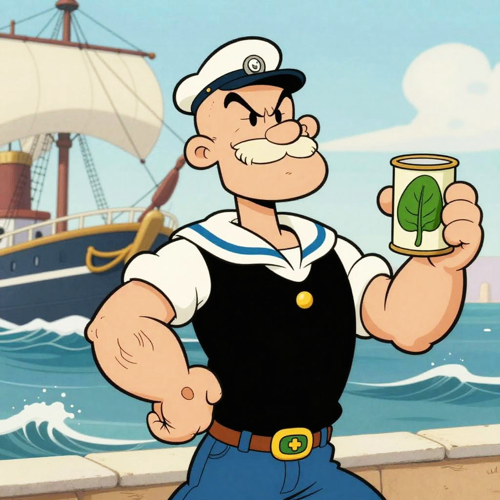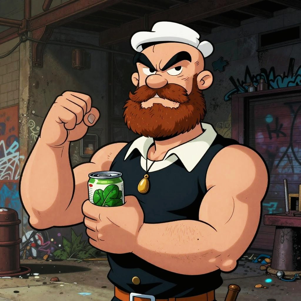 Popeye with a beard, modern comic book style, intense expression, muscular arms flexing, holding spinach can, detailed beard and scruffy hair, dark shadows, gritty urban background with graffiti and dockside elements