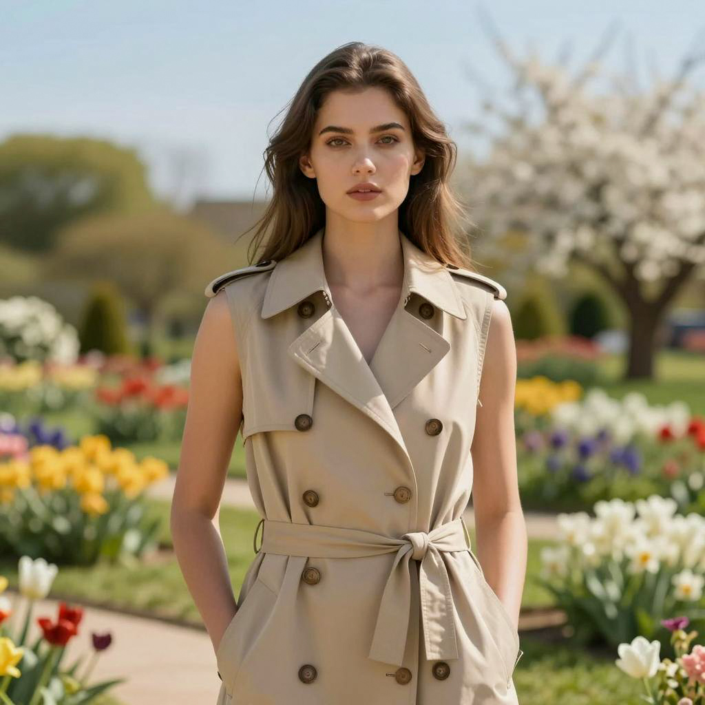 Sleeveless coat, photograph of beautiful young woman, long brown hair, wearing sleeveless beige trench coat with buttons, hands in pockets, standing in blooming garden, colorful flowers in background, sunny day, clear blue sky, natural light, subtle makeup, serious expression, shallow depth of field, realistic style, portrait orientation, soft focus, outdoor setting, summertime vibes