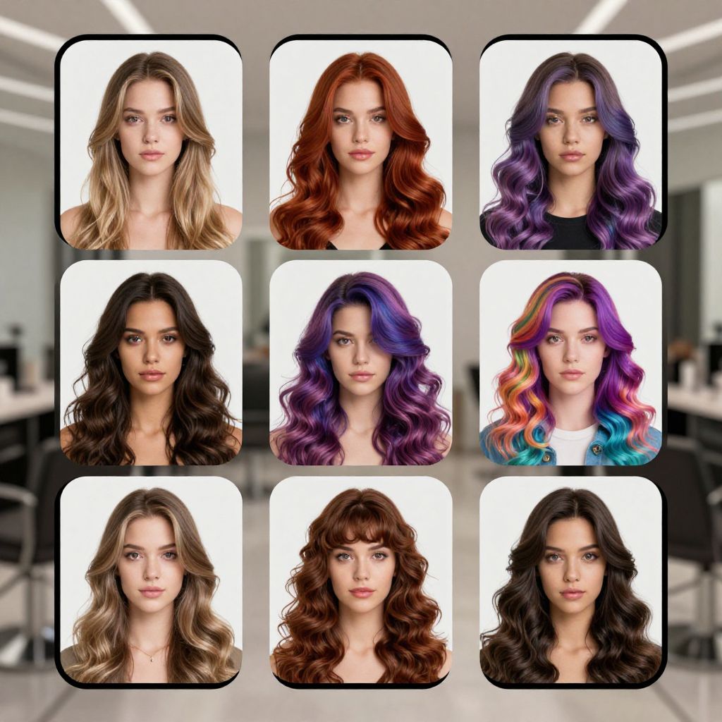 Virtual hairstyle try on interface, diverse models with changing hairstyles in a virtual salon environment, glossy digital mirrors, vibrant hair colors from natural to fantasy shades, cutting edge AR filters and light reflections enhancing realism