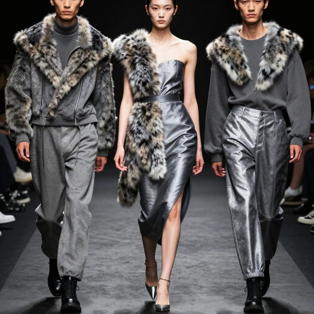 Grey wolf clothing as avant-garde fashion, blending wolf fur prints and synthetic fabrics, asymmetrical cuts, deep grey and silver hues, displayed on a runway with dramatic lighting